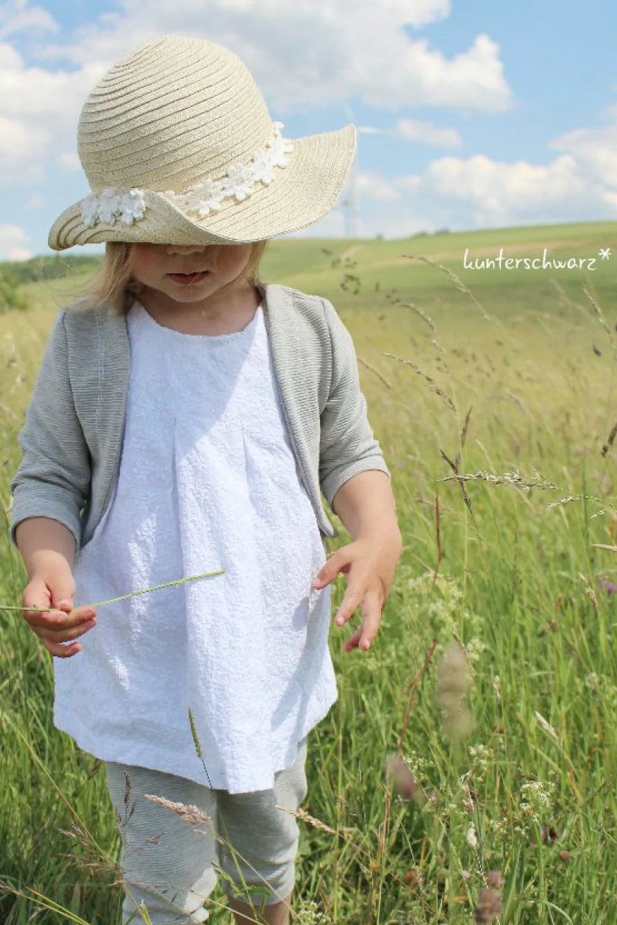 Four Chapter-Schnitt "Das gebundene Hängeding" das freche Sommer-Hängerchen zum Binden für Kinder Es war dieser eine warme Sommer, er liegt schon eine Weile zurück, aber das spielt keine Rolle, denn in diesem Sommer kamen zwei kleine Sommerhängerchen auf die Welt. Sie waren sich so ähnlich und doch waren sie so unterschiedlich, unterschiedlicher hätten sie nicht sein können. Von dem einen möchte ich euch heute erzählen. Es war ein kleiner Rabauke - ja hätte es einen Michel unter den Hängerchen gegeben wäre er wohl dieser gewesen. Es war trotzdem von ganzen Wesen gut, es war halt nur eben auch wild uns einfallsreich und vor allem war es unglaublich lebenslustig. Es wollte weder nur eine Länge und brav sein, es wollte frech und kurz sein und am nächsten Tag wollte es gerade und lang sein aber dafür mit dicken Schleifen auf den Schultern. Es wollte an festlichen Anlässen eben genau so gegenübertreten können - evtl. mit hübschen Rüschen oder einem niedlichen Volant. Aber es wollte wirklich nie nie brav sein. Das kleine Hängerchen hatte wirklich immer nur Flausen im Kopf, einmal ging es auf den Geburtstag der Oma ganz kurz zu einer tollen hochgeschnittenen Hose. Nun ja ihr könnt euch ja denken, dass die biedere Oma es sogar nicht gern sah, dass das kleine Hängerchen lieber kurz auf dem Geburtstag tanze, lachte und obendrein auch noch viel Schabernack anrichtete. Ja aber so war es nun mal unser kleines gebundenes Hängerchen, eben etwas mehr wie ein kleiner Michel ganz im Gegenteil zu seiner Schwester dem kleinen Sommerding... Aber das ihr Lieben, ist eine andere Geschichte. Das kleine Hängerchen kommt daher für euch in 3 verschiedenen Längen. Ihr könnt das Hängerchen Popolang ganz gerade geschnitten nähen oder auch etwas länger mit einem Vokuhila oder aber auch frech mit dem wirklich kürzeren Längen die vorne ebenfalls eine Vokuhilarundung haben. Natürlich könnt ihr alle Längen mit einer breiteren und einer schmaleren Volantrüsche versehen und eure Knopfleiste darf sogar mit einer Rüsche verziert werden. Das Hängerchen wird, wenn die Schultern geschlossen sind an diesen mit einem Band etwas zusammen gezogen oder aber ihr lasst die Schultern offen sodass diese lediglich mit einer Schleife zusammengebunden werden. Im Schnittmuster findet ihr auch Flügelärmelchen.Schwierigkeitsgrad: ***** Größen: 74 - 170 Inklusiver bebilderter Schritt-für-Schritt-Anlöeitung. Varianten des Hängedings: ° in drei verschiedenen Längen nähbar ebenfalls mit Vokuhila in zwei Längen ° mit schmalen und breiteren Rüschenvolant ° optionaler Knopfleisten-Rüsche ° vier Ärmeloptioen - normale Träger mit und ohne Flügelchen, gebunde Träger mit und ohne Flügelärmelchen ° verschiedene Rückenoptionen wie dem einfachen normalen Rücken, dem Rücken mit KellerfalteMaterial:Das Hängeding lässt sich besonders gerne aus leichter Webware wie Musselin und Viskose-Stoffen nähen. Auch Jerseystoffe lassen sich toll zu einem Hängerchen verarbeiten. Bitte beachte, dass das Kopieren, Tauschen und Weitergeben der Anleitung inklusive Schnittmuster nicht gestattet ist. © Copyright Four Chapter, Franziska Franke – Alle Rechte vorbehalten
