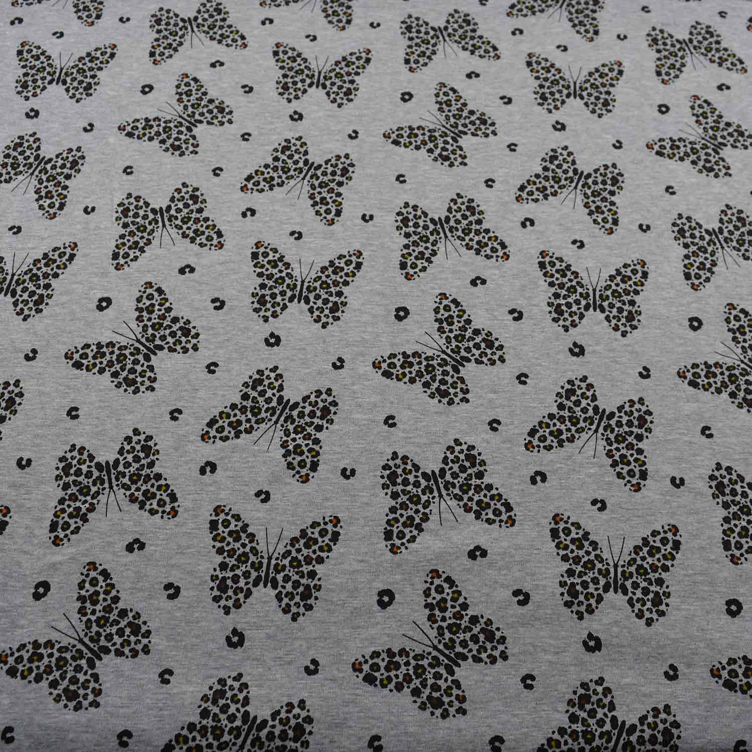 Das Dessin besteht aus großen Schmetterlingen, die allerdings nicht auf die klassische Art und Weise gezeichnet sind. Diese Schmetterlinge bestehen aus kleinen Leoparden-Flecken, die sehr elegant zu Schmetterlingsflügeln angeordnet sind.