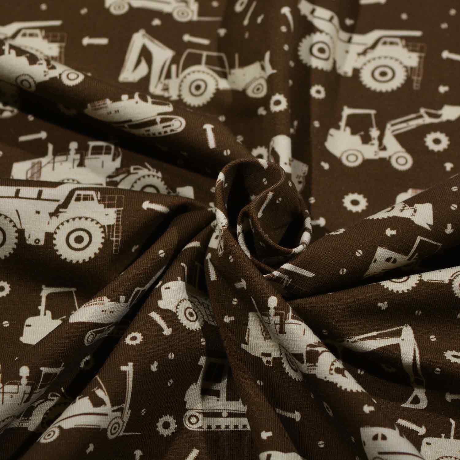 Niedliche, kleine Bagger, Trecker, Abschleppwagen und Kipplaster fahren hier eifrig auf schnurgeraden Straßen entlang, vorbei an kleinen Baumgrüppchen und Verkehrshütchen.Der Untergrund, auf dem dieses Spektakel stattfindet ist naturfarben und zeigt die Optik ungefärbten Baumwoll-Jerseys. Der Stoff ist also nicht einfach in hellem beige gleichmäßig gefärbt, er zeigt natürliche Verfärbungen und Strukturen ungebleichter Baumwolle, mit allen Vorteilen, die wunderbarer, elastischer Jersey mit sich bringt.