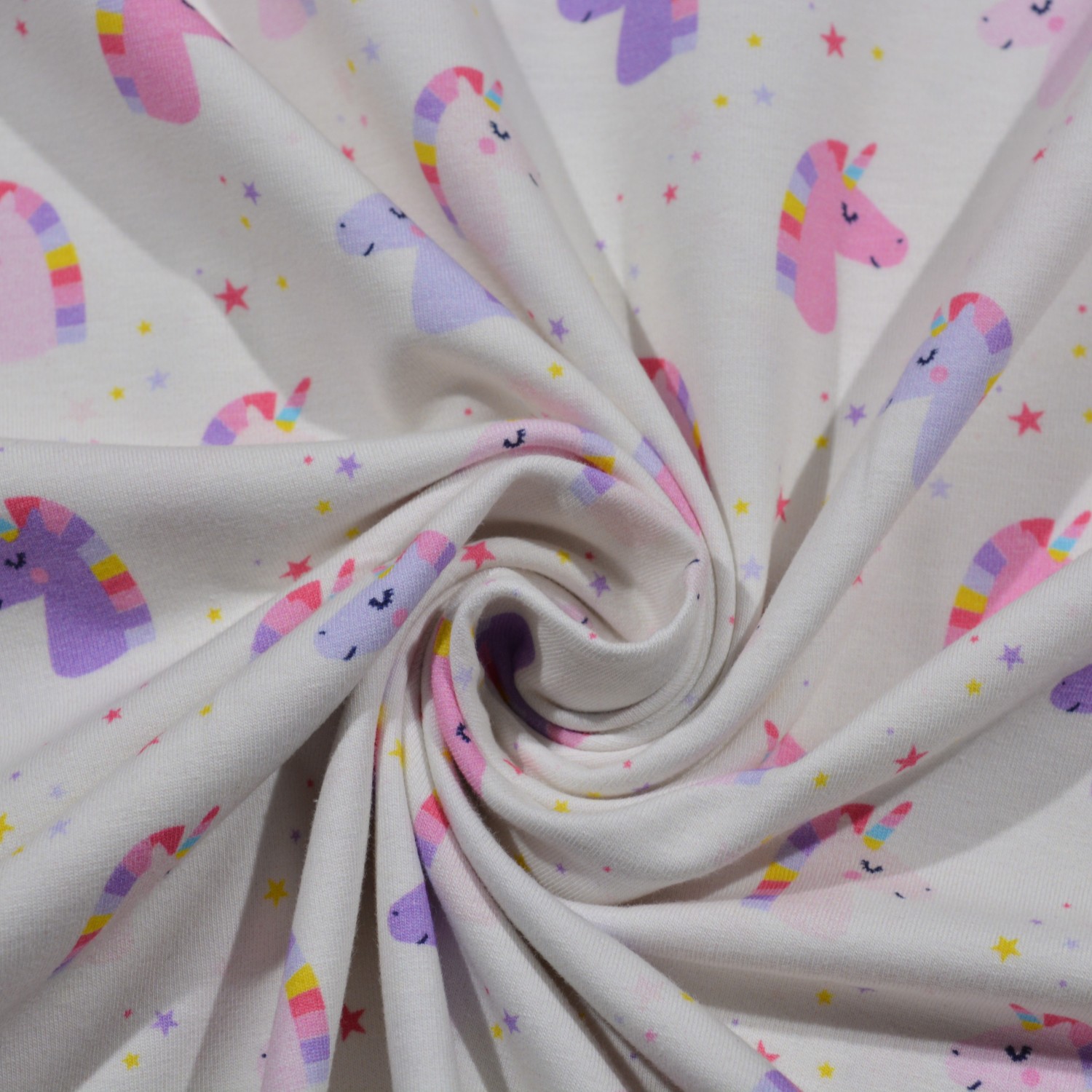 Baumwoll Jersey Stoff – Verspieltes Einhorn-Muster auf hellem Hintergrund