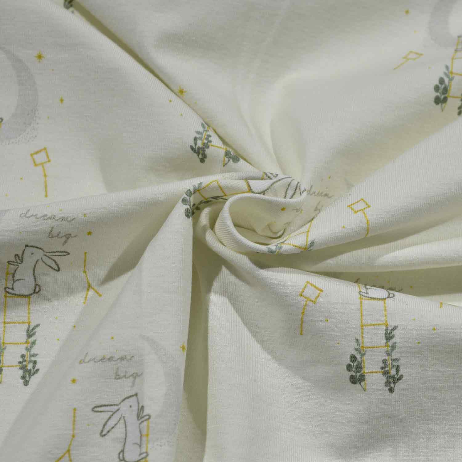 Entzückende Baumwoll-Jersey-Serie Dina aus dem Hause Glünz. Dieser kuschelige Jersey mit wollweißem Untergrund ist mit kleinen, weißen Häschen mit langen Ohren und niedlichen Pfötchen bedruckt. Ein süßer Stoff mit fröhlicher Ausstrahlung.