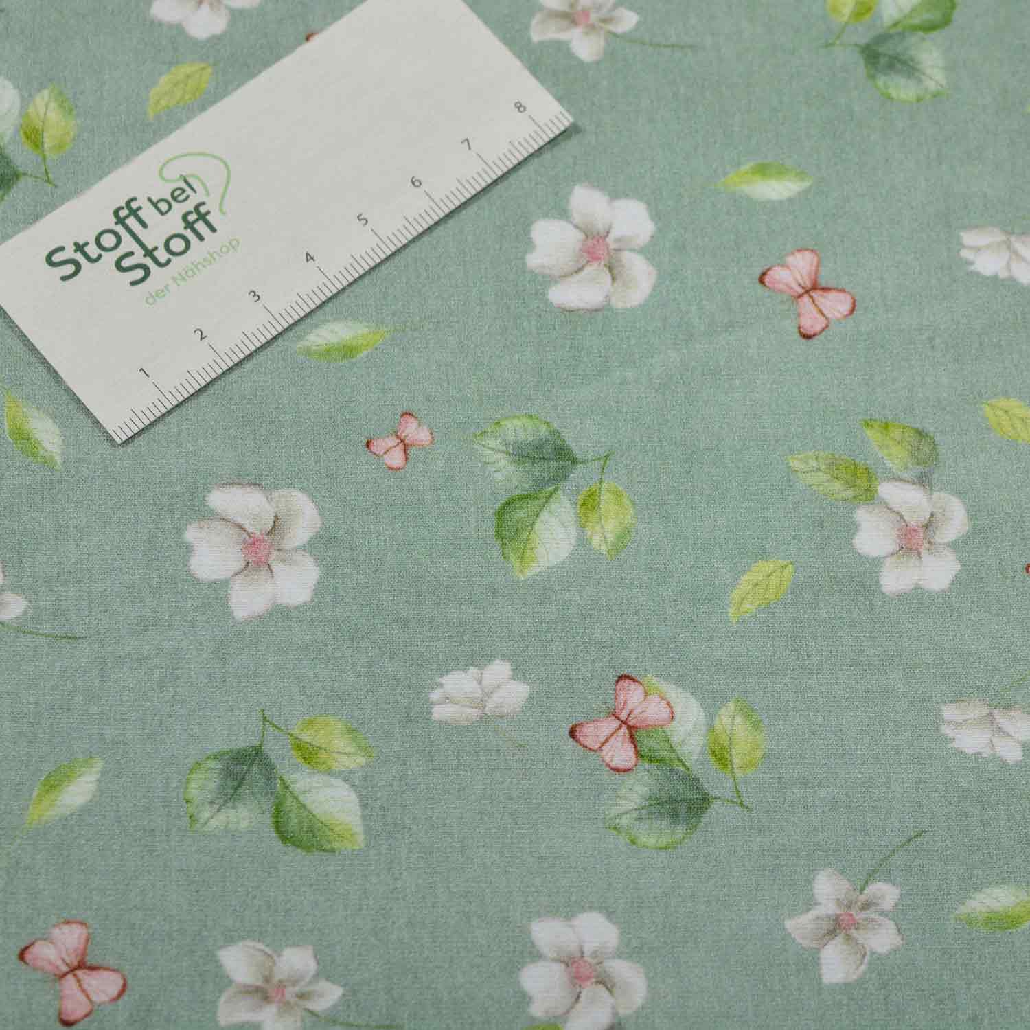 Entzückende Baumwoll-Jersey-Serie Dina aus dem Hause Glünz. Dieser kuschelige Jersey mit salbeigrünem Untergrund ist mit entzückenden weißen Blüten, rosa Schmetterlingen und zarten Blättern bedruckt. Er eignet sich toll als Kombi-Stoff zu der Artikelnummer SBS11159, die ein fast identisches Dessin mit einem Rehkitz zeigt.Ein wunderschönes, liebliches Dessin vor allem für Kinder.