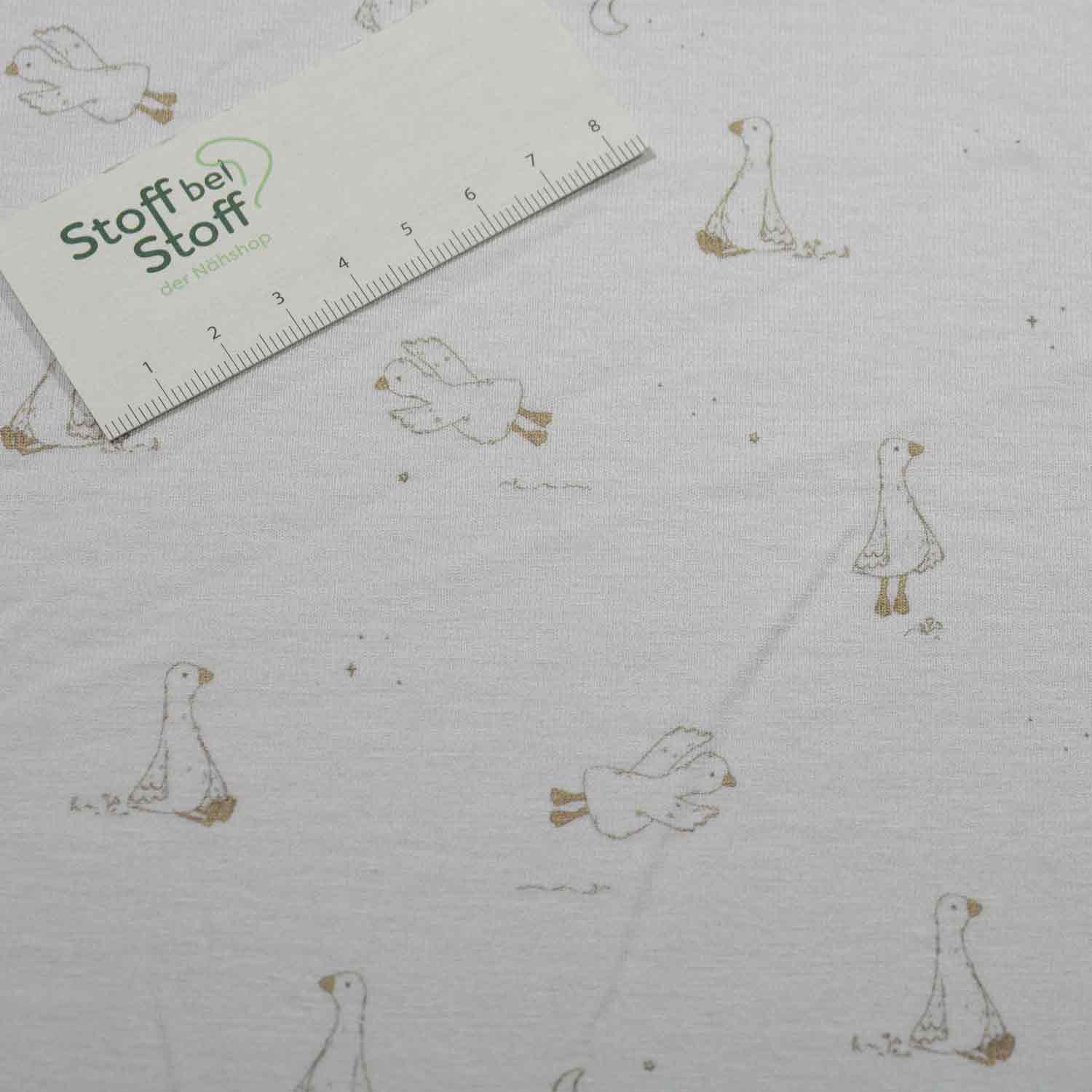 Entzückende Baumwoll-Jersey-Serie Dina aus dem Hause Glünz. Dieser kuschelige Jersey mit naturgefärbtem Untergrund ist mit kleinen Gänsen bedruckt, die herumlaufen, sich den Mond ansehen oder einen kleinen Rundflug absolvieren.Ein entzückendes Dessin vor allem für Kinder.