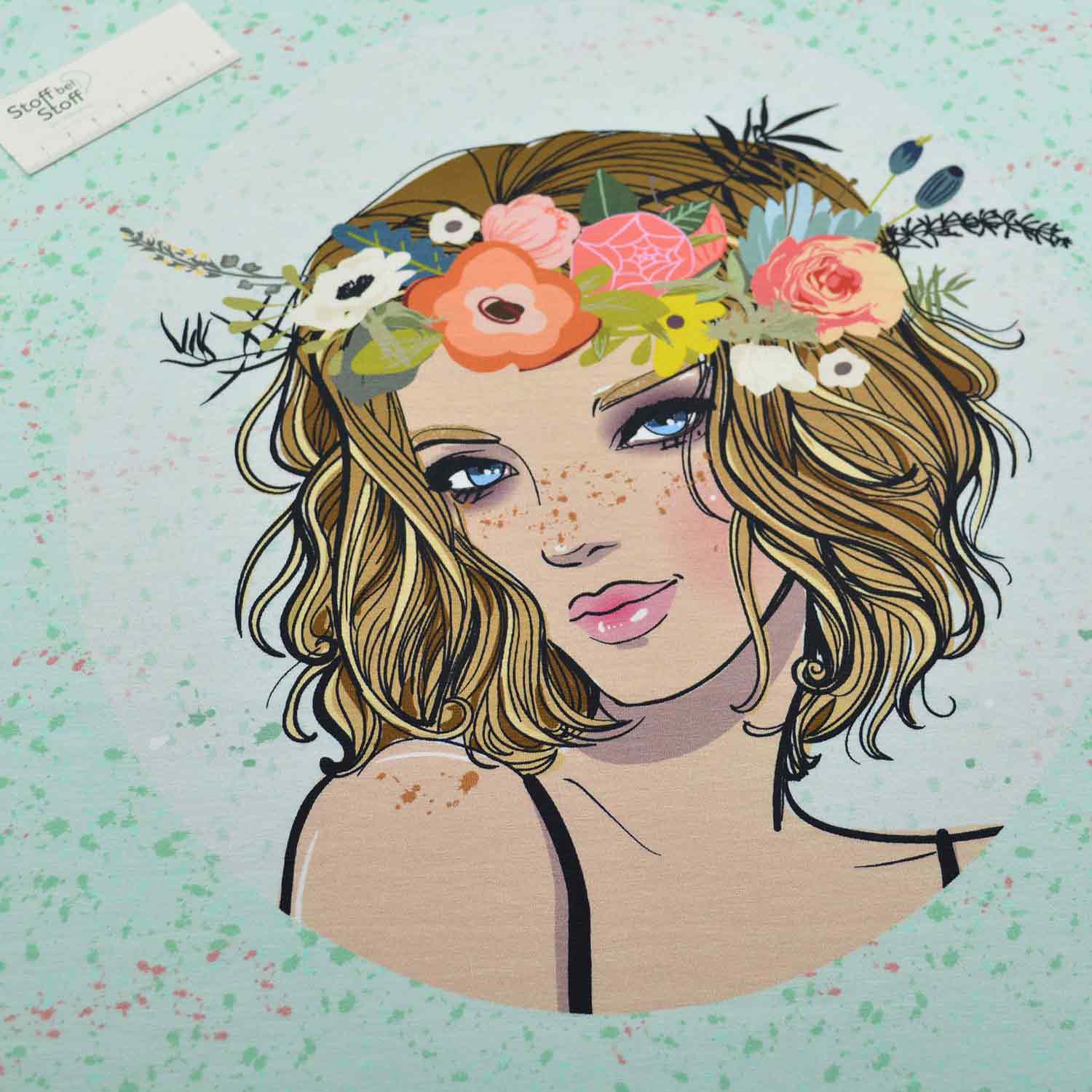 Großes Jersey-Panel mit wunderschönem Motiv.Der größte Teil des Untergrunds ist in der Farbe eisminze gefärbt und mit winzigen Flecken in mauve und grün übersät. Das Panel-Motiv zeigt ein wunderschön gezeichnetes Mädchen, das halb abgewandt steht und dem Betrachter den Kopf über die leicht hochgezogene Schulter zuwendet.Das kinnlange, wellige Haar ist mit einem Blütenkranz geschmückt, während sie dem Betrachter einen koketten Blick aus Smokey Eyes zuwirft. Die Nase ist mit frechen Sommersprossen gesprenkelt.Das Bild strahlt frühlingshafte Lebenslust und Frische aus.Ein Viertel des Stoffs ist mit Blumen in gelb, orange, rot und blau bedruckt und damit perfekt geeignet, um originelle Einfassungen und Bündchen zu gestalten.Perfektes Material für gemütliche Shirts, Tuniken und Kleider. Als Panel wird dieser Artikel nicht als Meterware, sondern Stückweise verkauft.Ein Panel hat die Gesamtabmessung von etwa 190cm x 150cm.