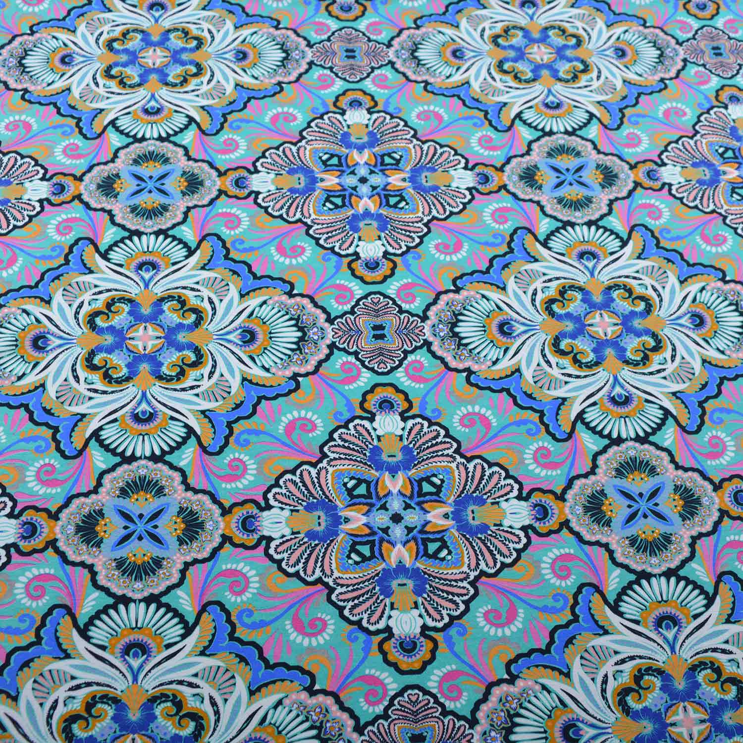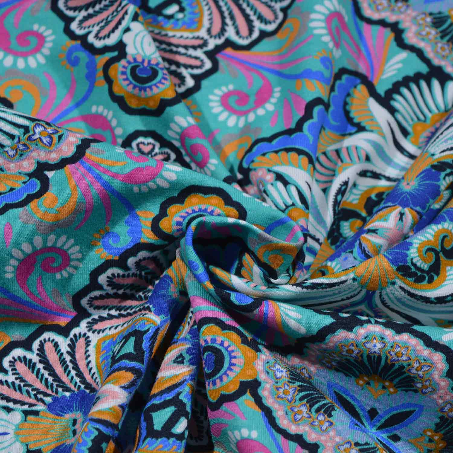 In schwarz, weiß, rosa, orange, fuchsia und blauviolett ist ein üppiges, floral anmutendes Ornament-Dessin aufgedruckt. Die üppigen Ornamente sind schwer zu beschreiben, aber sehr eindrucksvoll in ihrer Üppigkeit und Kontraststärke.