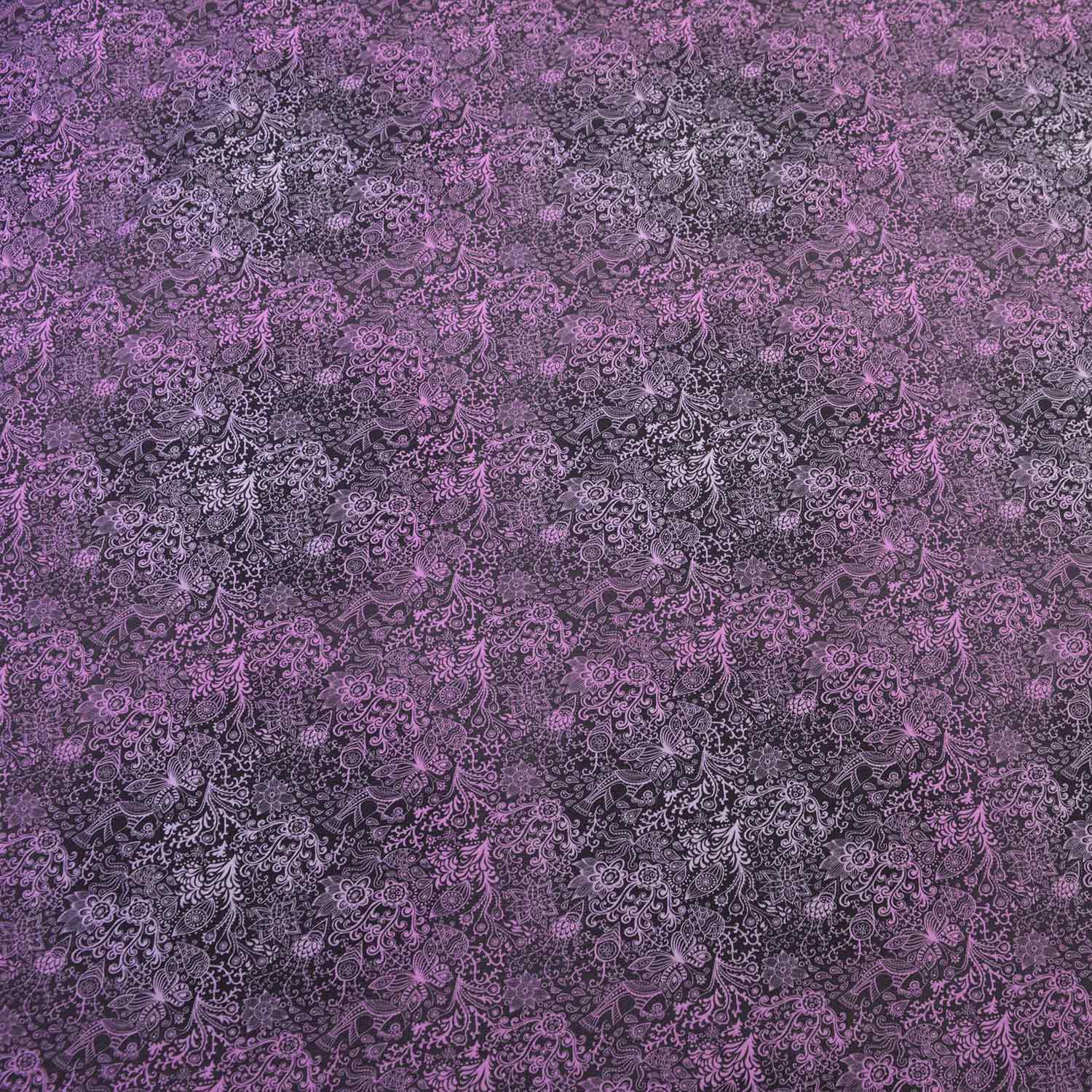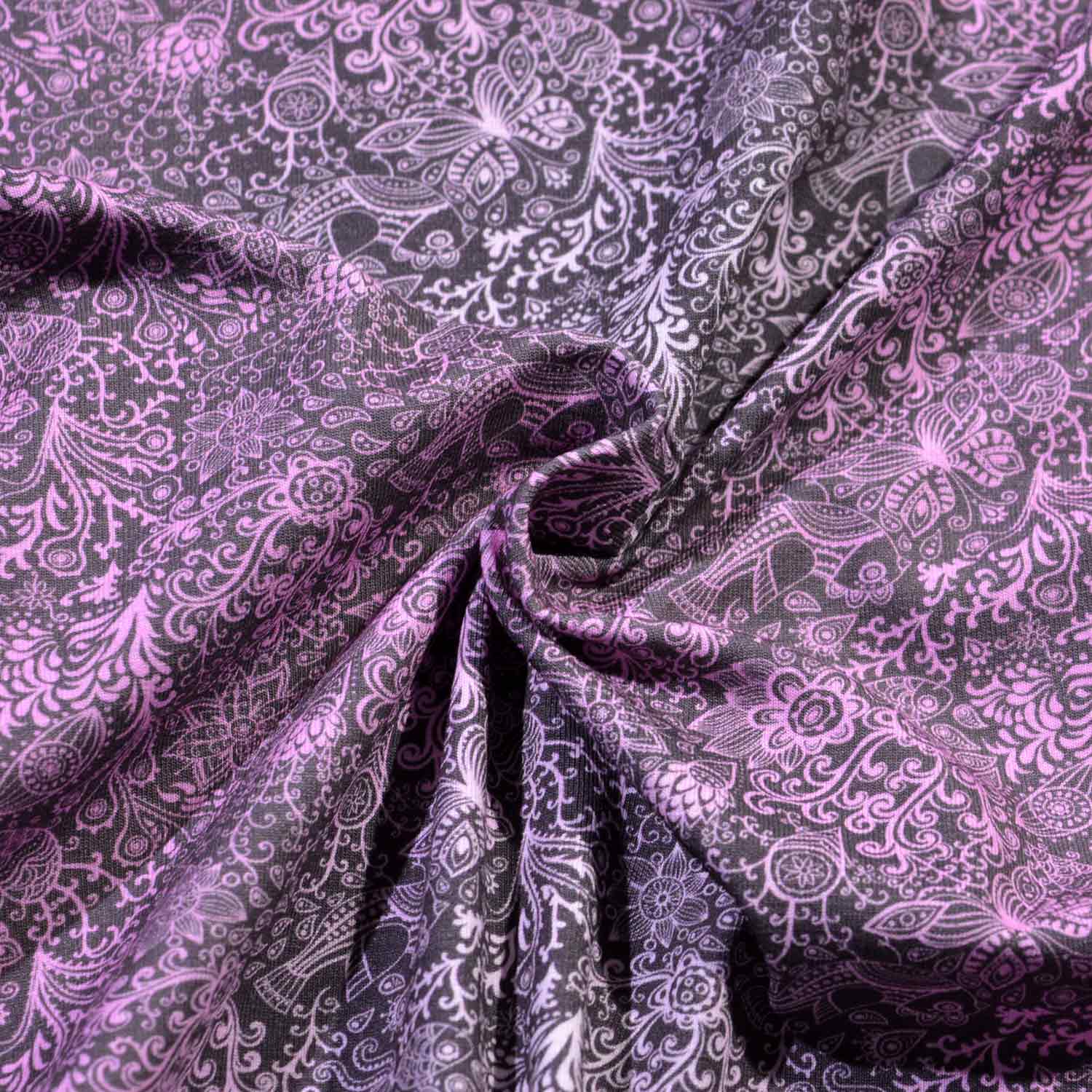 Spotlight ist ein weicher Baumwoll Jersey in einem satten lila und mit einem zarten floralen Muster in einem helleren violett bedruckt. In regelmäßigen Abständen wird der Stoff wie mit kleinen Scheinwerfern - Spotlights - kreisförmig aufgehellt zu Akzenten in flieder.