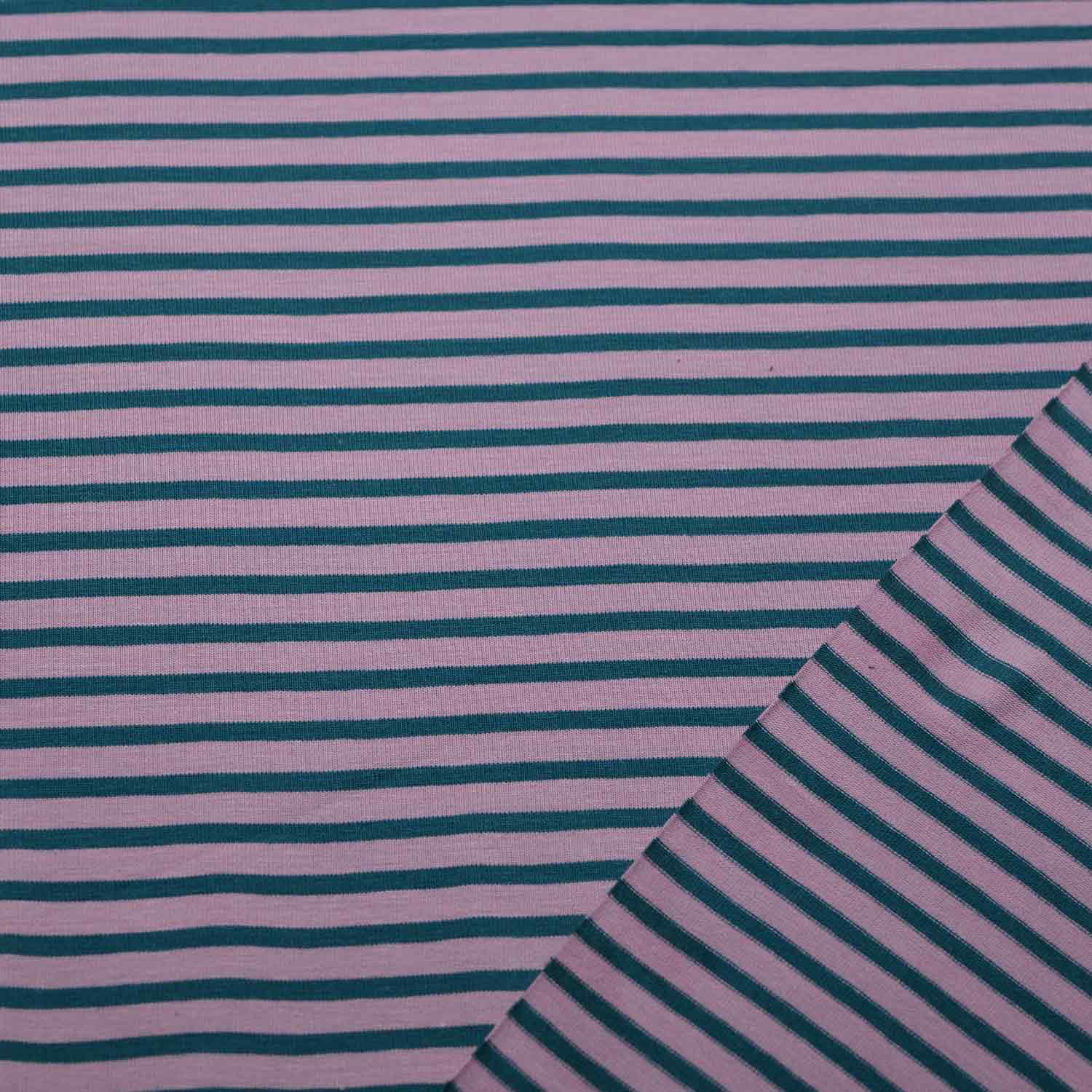 Schöner Streifen-Jersey in gestrickter, nicht gedruckter Variante. Die freundlichen Streifen haben zwei unterschiedliche Breiten. Der breite Streifen ist etwa 6mm dick und hat hier die Farbe Mauve. Der schmalere Streifen ist etwa 3mm dick und ist Grau gefärbt. Ein schönes Streifen-Dessin mit sanfter Note.