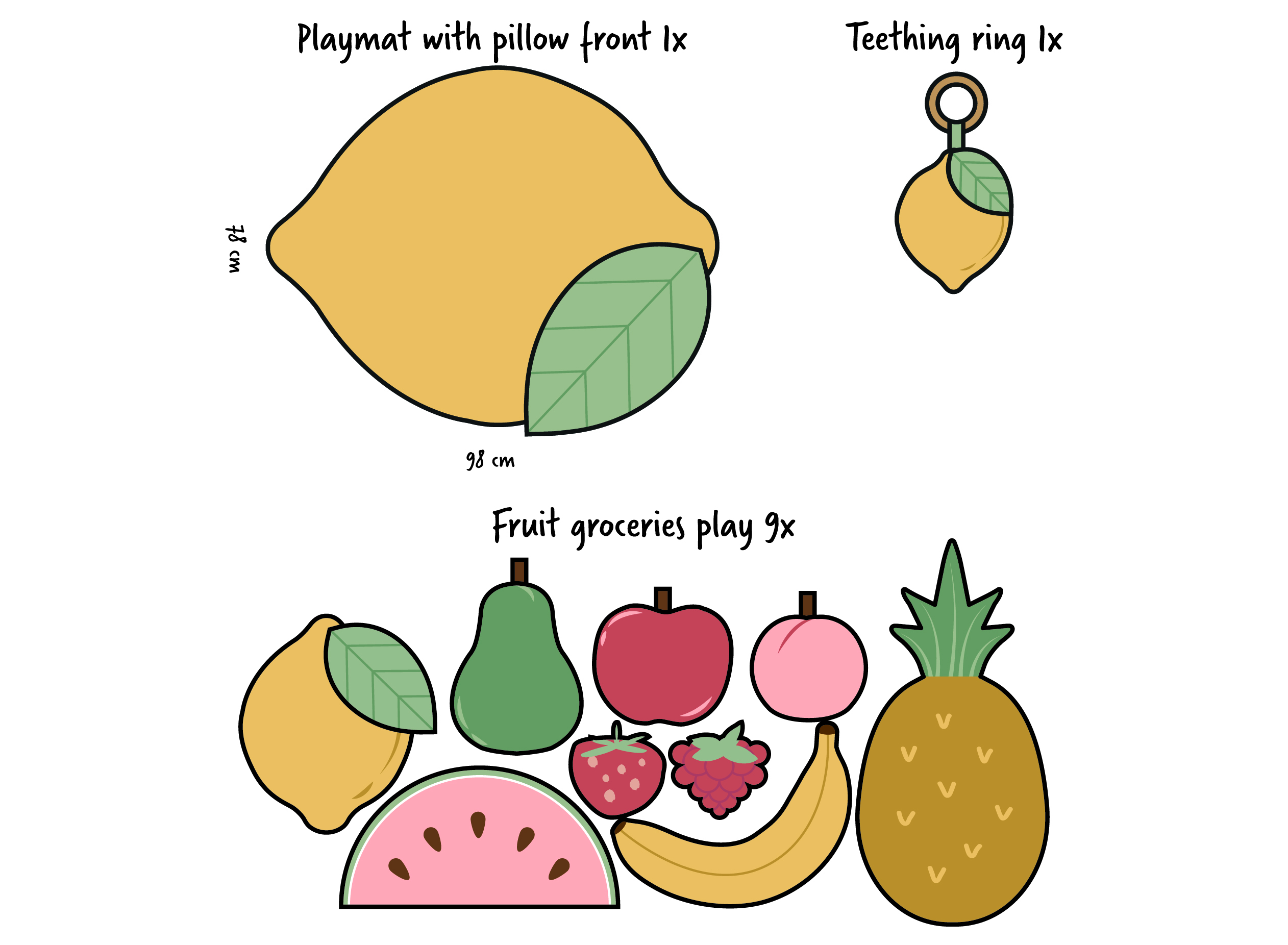 Unser hochwertiger Baumwollstoff "Babyspielset" ist die perfekte Wahl für kreative Eltern und DIY-Enthusiasten, die eine liebevolle und individuelle Spielumgebung für ihr Baby schaffen möchten. Der Stoff besteht aus 100% Baumwolle, die für ihre Weichheit, Atmungsaktivität und Hautfreundlichkeit bekannt ist. Mit einer Breite von 140 cm und einem Gewicht von 115 g/m² bietet dieser Stoff genau die richtige Kombination aus Leichtigkeit und Strapazierfähigkeit, die für Babyartikel ideal ist.Dieses Set enthält ein komplettes Schnittmuster, das es Ihnen ermöglicht, eine wunderschöne Spielmatte in Früchte Design zu nähen, ergänzt durch neun niedliche Früchtekissen und ein Zahnkissen zum aufhängen. Der Stoff ist vielseitig einsetzbar und eignet sich hervorragend für die Herstellung von sicheren und komfortablen Babyspielzeugen und -accessoires.
