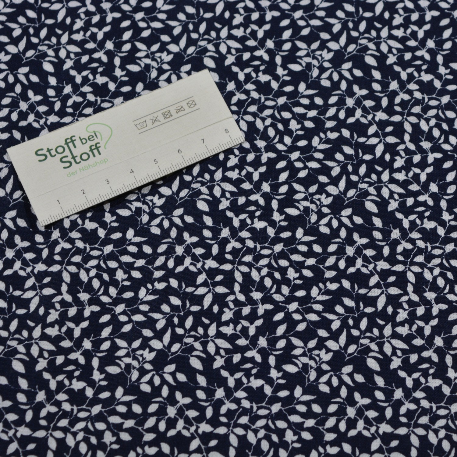 Dunkelblauer Baumwollstoff mit filigranem BlattmusterDieser dunkelblaue Baumwollstoff mit einem zarten weißen Blattmuster besticht durch seine dezente Eleganz und Vielseitigkeit. Das feine Blattdesign verleiht dem Stoff eine natürliche, zeitlose Ästhetik, die sowohl für Bekleidung als auch für Heimtextilien ideal geeignet ist. Der hochwertige Baumwollstoff lässt sich angenehm verarbeiten und eignet sich perfekt für sommerliche Blusen, Kleider, Schals oder Dekorationen wie Kissenbezüge und Vorhänge.Mit seiner pflegeleichten und langlebigen Qualität bietet dieser Stoff eine optimale Grundlage für kreative Nähprojekte und modische Accessoires.