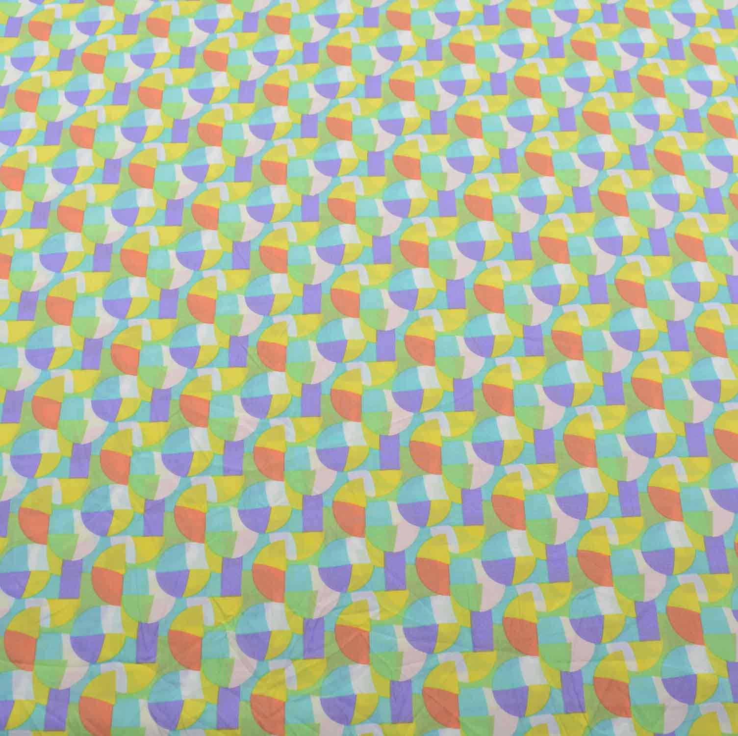 Federleichter Baumwoll-Rayon für sommerliche Mode.Der hauchzarte, kühle und glatte Stoff ist mit einem interessanten Kreis-Muster bedruckt. Der Grundton ist ein kräftiger Pfirsich-Ton. die Kreise sind grob geviertelt, und jedes Viertel ist anders gefärbt. Ein Viertel weiß, eins Petrol, eins Violett und eins Hellgrün. Dazu kommen Elemente in Rosa und Violett. Die Kreise überlagern einander an den Kanten und ergeben so ein wildes Gewirr aus grafischen Elementen.Ein Hauch von Stoff für für leichte Schals, Tücher, Blusen, Tuniken und Kleider in einem grafischen, aber dennoch sommerlichen Dessin.