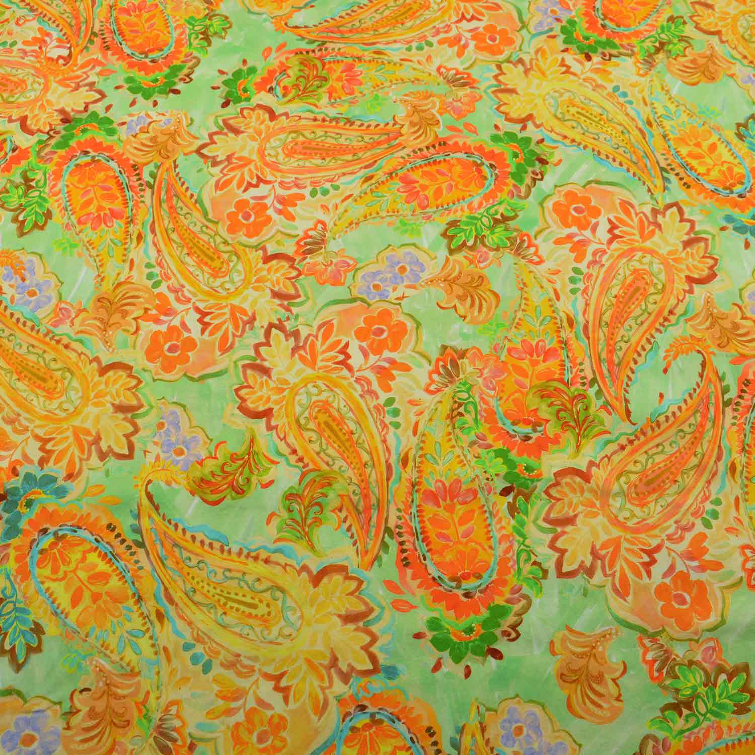 Ein pastelliger Grün-Ton für den Untergrund ist mit einem extravaganten Muster aus großzügigen Paisleys mit frühlingshaftem Blätter- und Blütenschmuck in den Farben Pastellgelb, Orange, Grün und Apricot mit vielen Zwischen-Tönen.