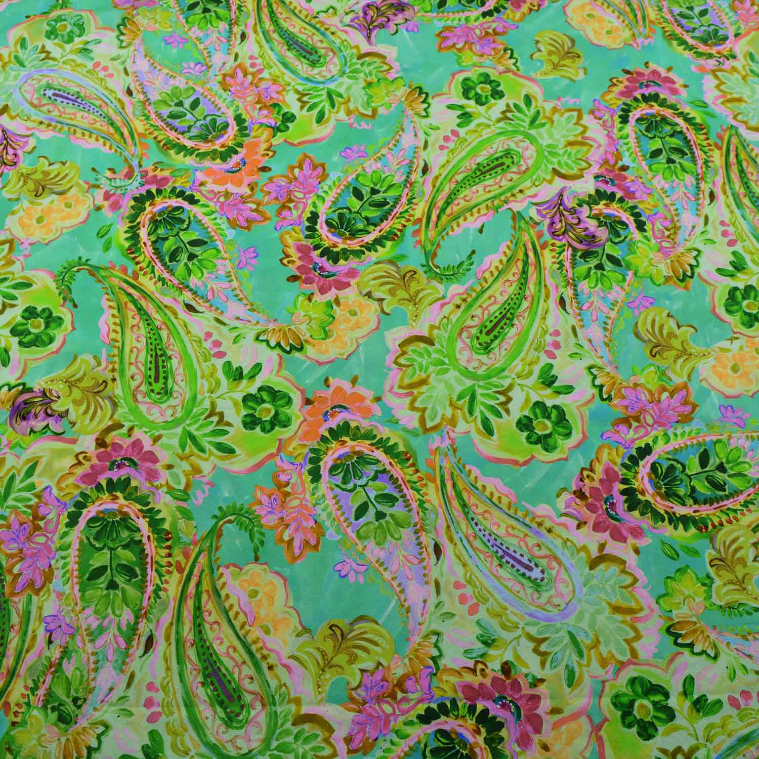 Ein leuchtender Blau-Grün-Ton für den Untergrund ist mit einem extravaganten Muster aus großzügigen Paisleys mit frühlingshaftem Blätter- und Blütenschmuck in den Farben Mint, Flieder, Grün und Rosa mit vielen Zwischen-Tönen.