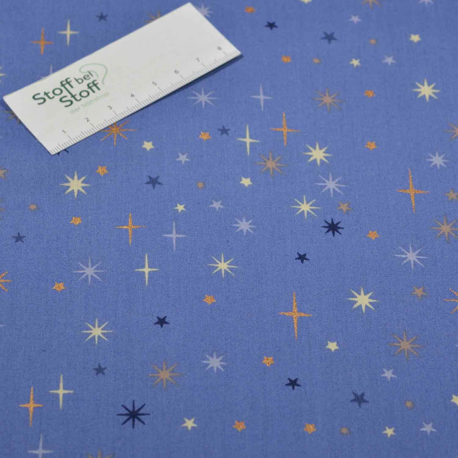 Aufgedruckt sind hier kleine, goldenen Sterne, die wild über den Stoff verstreut sind und sich an manchen Stellen etwas dichter zusammenballen.