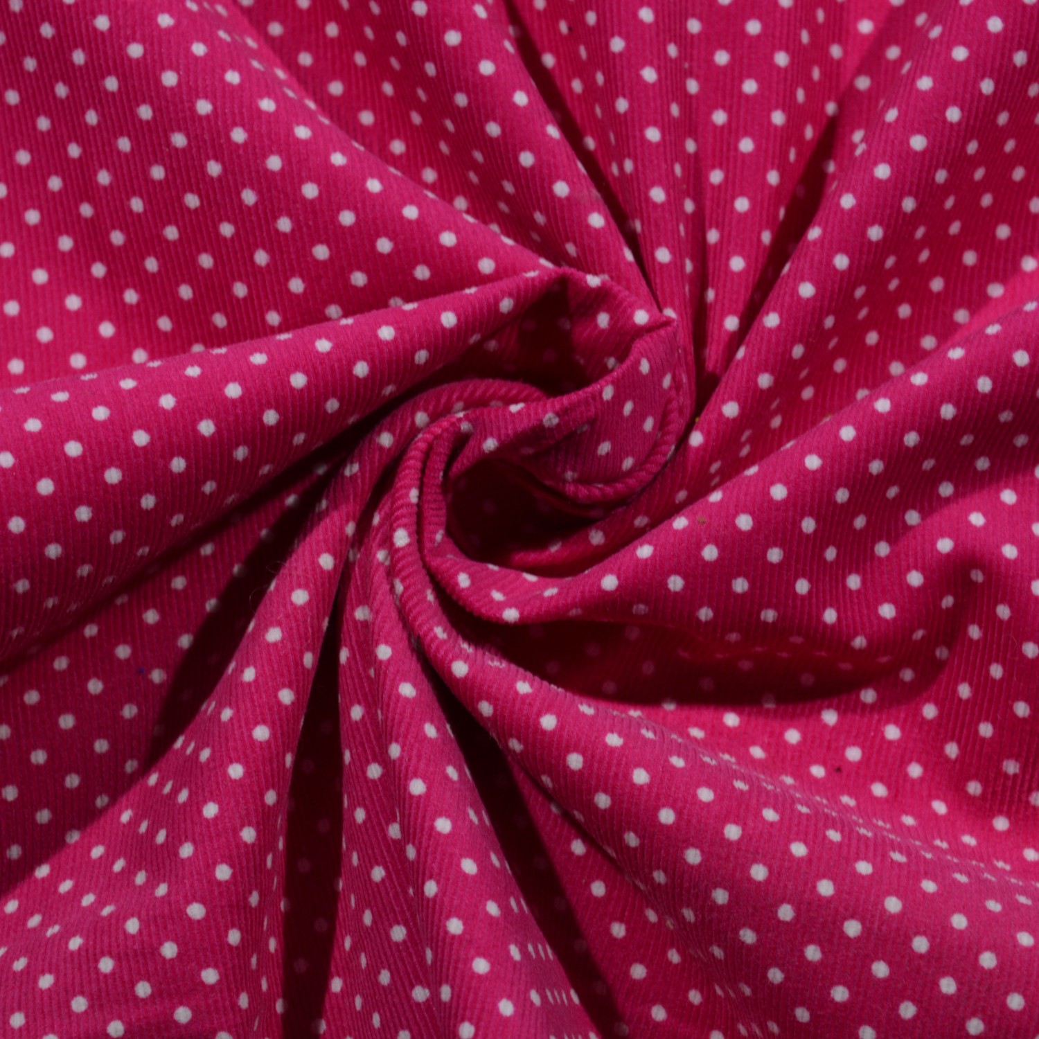 Setze fröhliche Akzente mit diesem farbenfrohen Feincord-Stoff in einem leuchtenden Pinkton mit zarten weißen Punkten. Die feine Rippenstruktur und die hochwertige Qualität aus 100% Baumwolle machen diesen Stoff besonders weich und angenehm zu tragen. Mit einer Breite von 140 cm und einem Gewicht von 220 g/m² eignet er sich hervorragend für modische Highlights wie Röcke, Kleider, Hosen oder kreative DIY-Projekte wie Taschen und Kissenbezüge. Ideal für alle, die frische und verspielte Designs lieben!