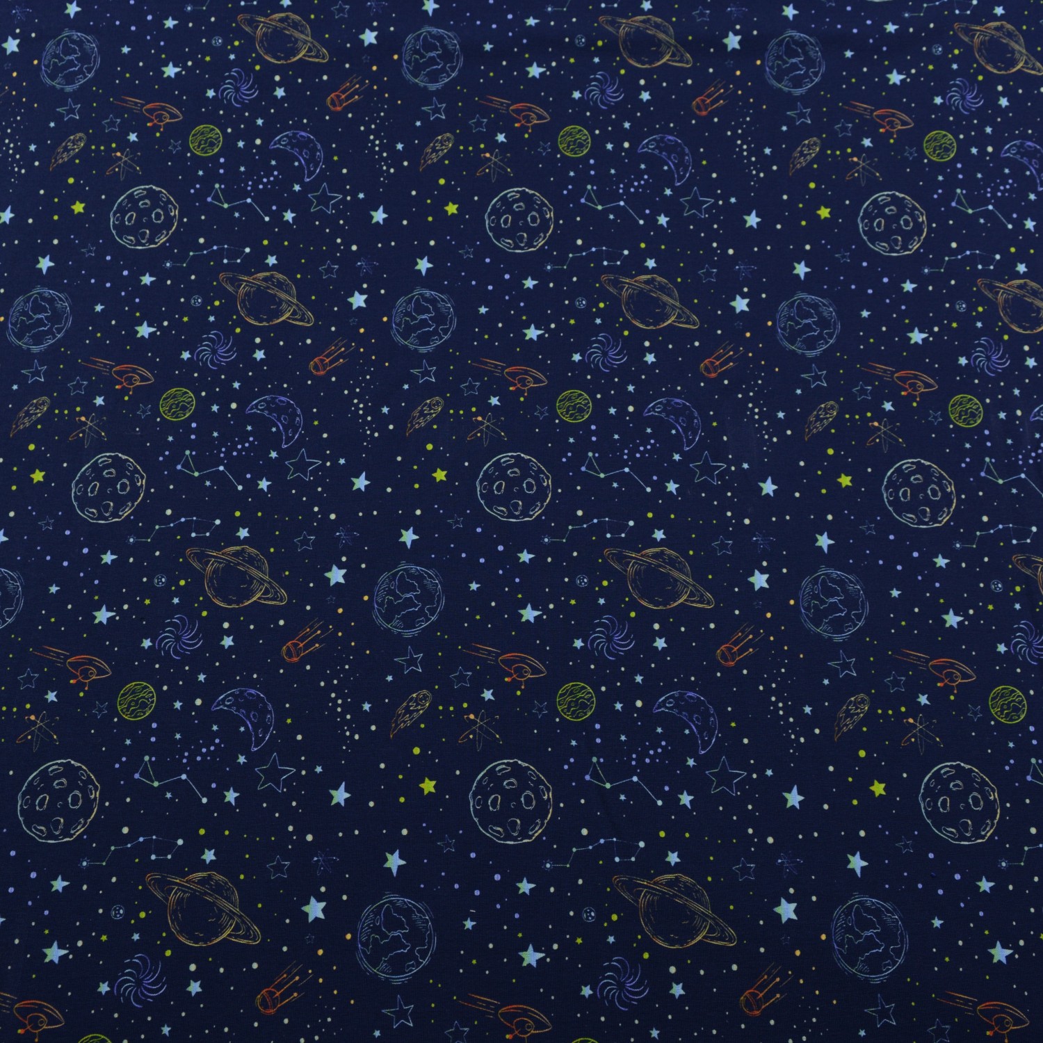 Das Design, wie auf dem Bild zu sehen, zeigt ein spannendes Weltraummotiv mit Planeten, Sternen und Raumschiffen auf einem dunkelblauen Hintergrund. Dieses fantasievolle Muster ist perfekt für Kinderbekleidung und lässt kleine Astronautenherzen höher schlagen. Die lebendigen Farben und die detailreichen Motive machen diesen Stoff zu einem echten Hingucker für jedes Projekt.