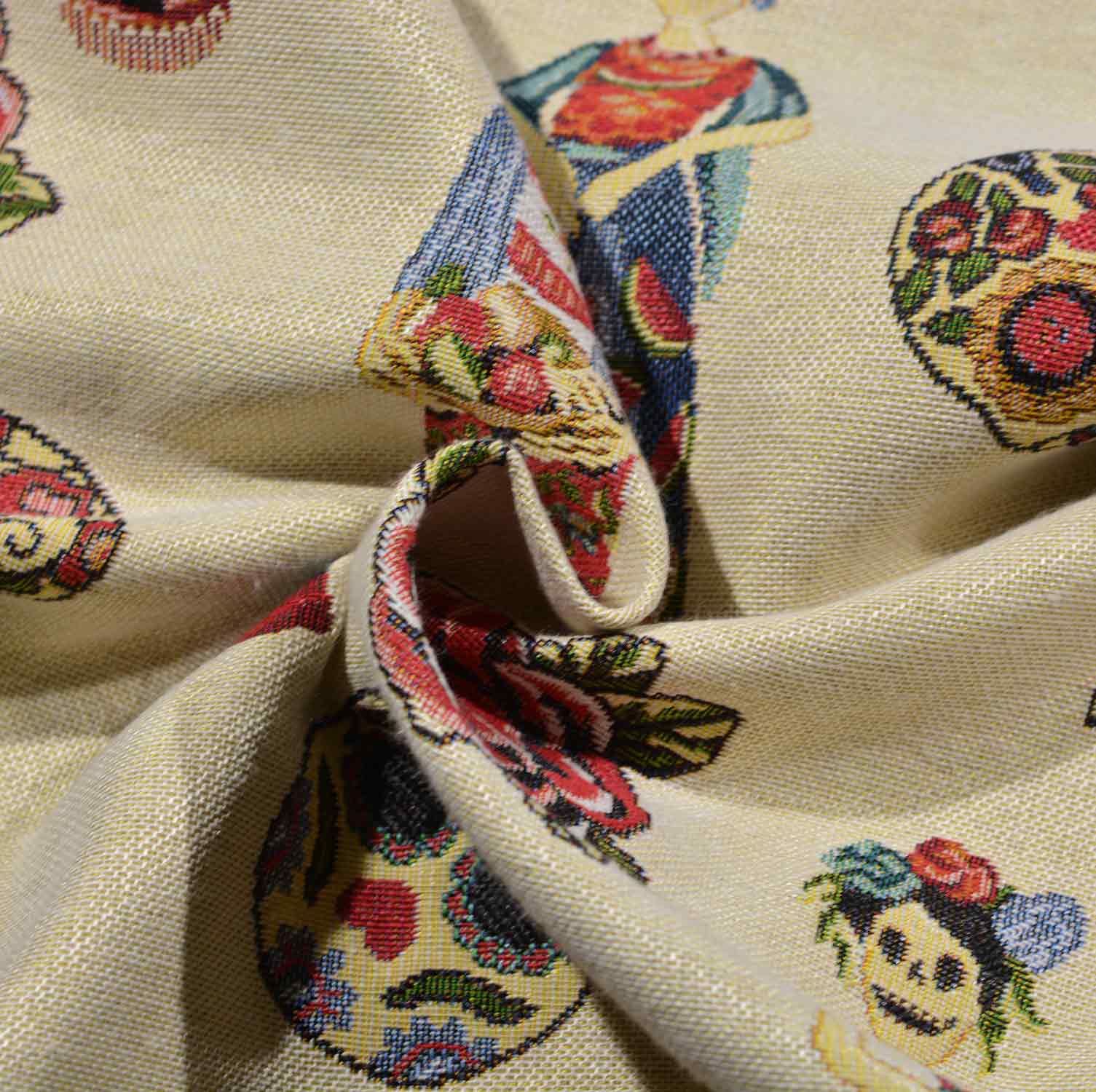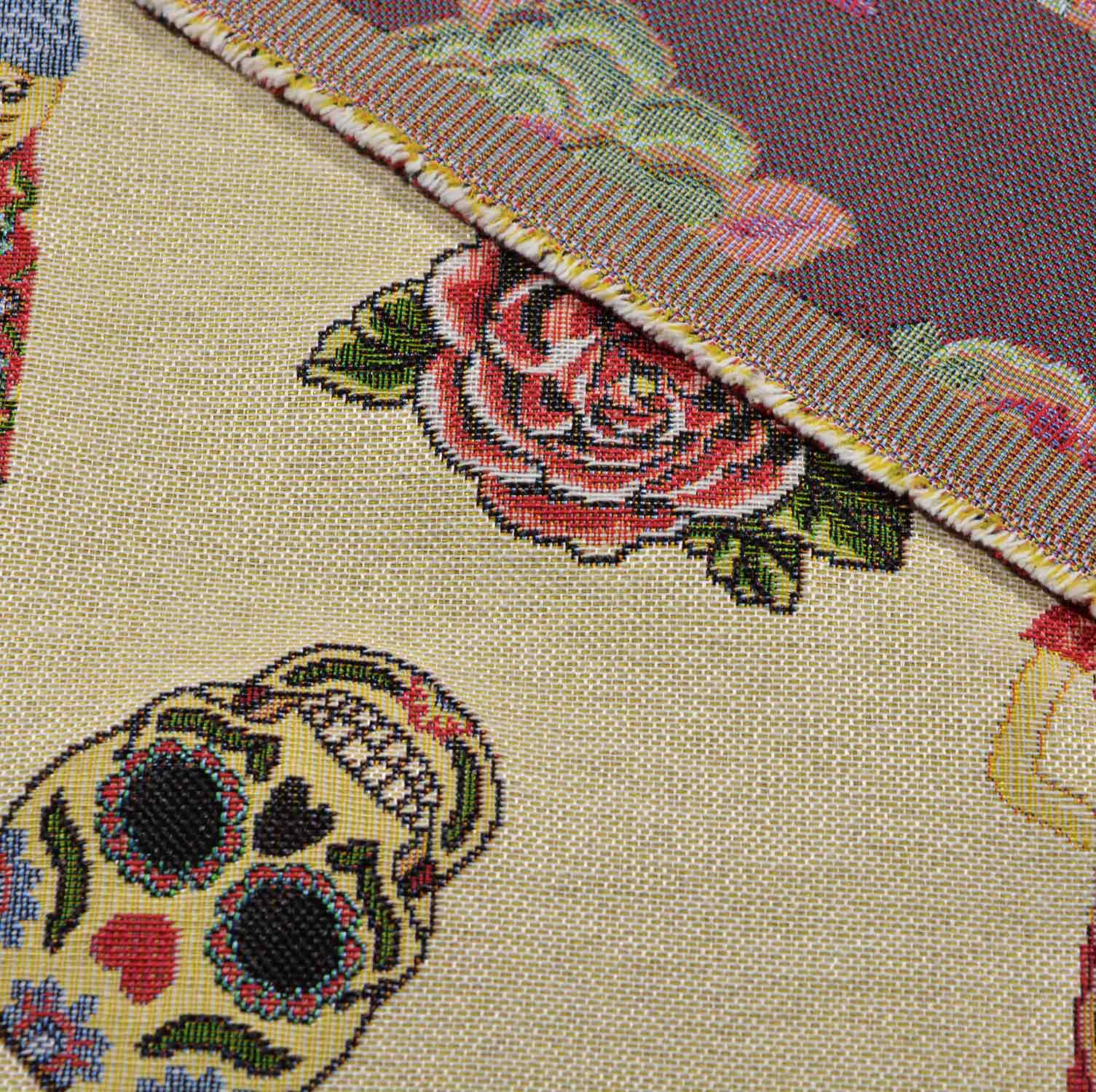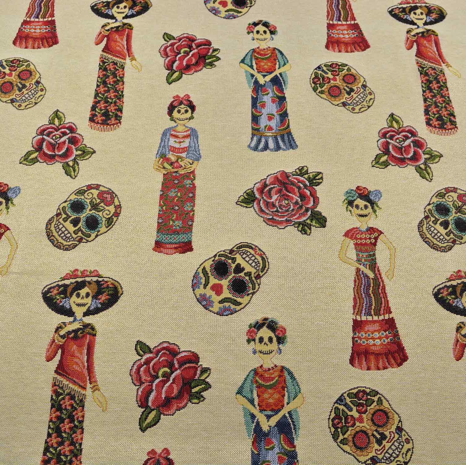Der helle, beige Untergrund mit großen Totenköpfen, Rosenblüten und weiblichen "Dia de los Muertos"-Figuren geschmückt. Die Totenköpfe sind wie bei dem mexikanischen Feiertag üblich mit bunten Blumen geschmückt, genau wie die Damen.