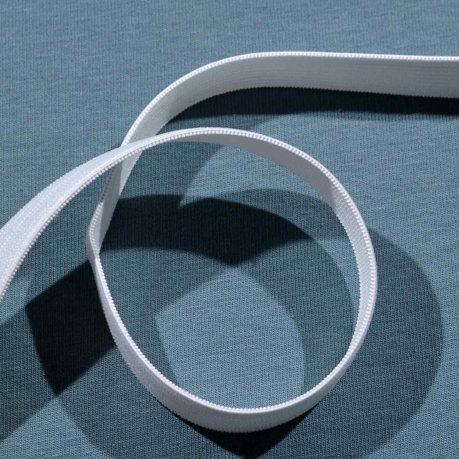 Einfaches Gummiband in weiß von 1cm Breite. Klassische, weiche, strapazierfähige Gummilitze zum Einziehen in Bündchen und ähnliche Verwendungszwecke.