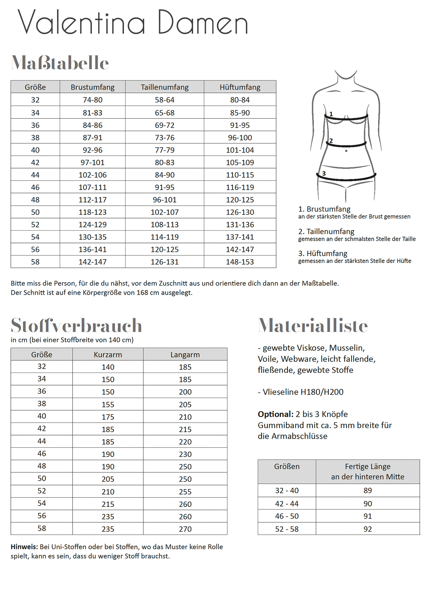 Geeignet für Webware wie z.B. Viskose, Krepp, Musselin, Voile u.Ä. leicht fallende, fließende, gewebte Stoffe