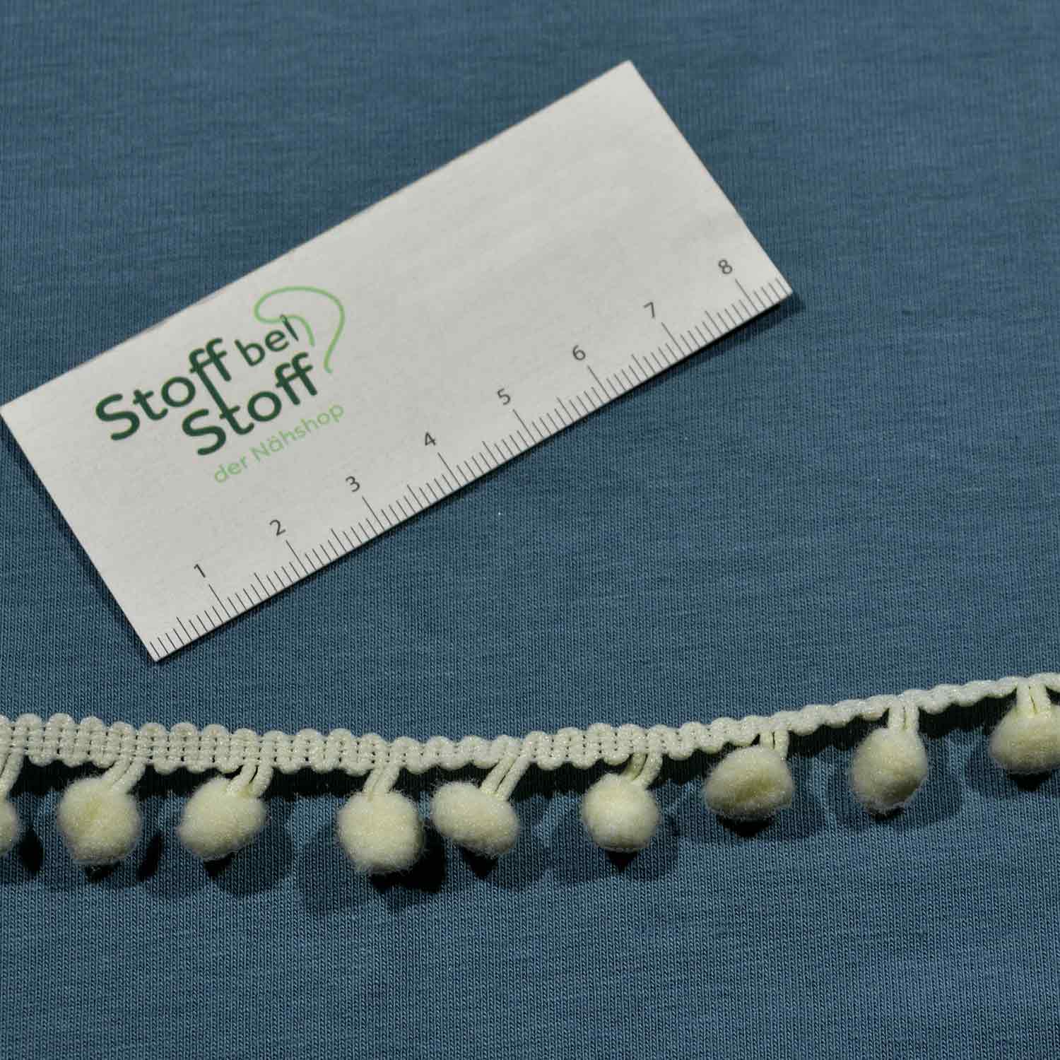 Lustige Bommelborte zur Verzierung von Deko-Projekten aller Art. Die Farbe ist ein gelblich-weißer Vanilleton. Das Band hat eine Gesamtbreite von 0,5cm, von der frei schwingende Pompoms von knapp 1cm Durchmesser baumeln. Bommelborte ist eine fröhliche Verzierung für Kleidung, aber vor allem für Deko- und Bastelprojekte aller Art. Taschen, Heimdeko, Schultüten und allerlei Anderes lassen sich mit der lustigen Borte verzieren.