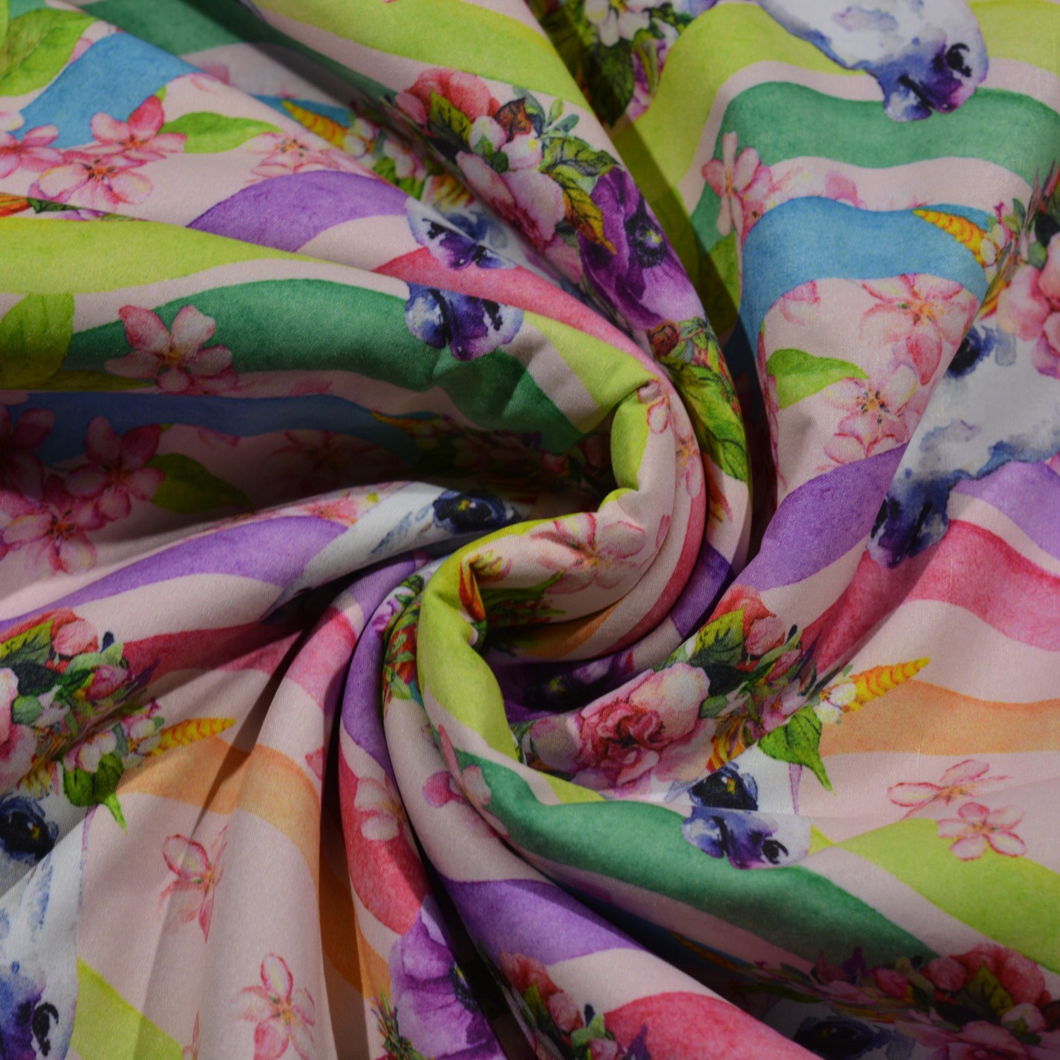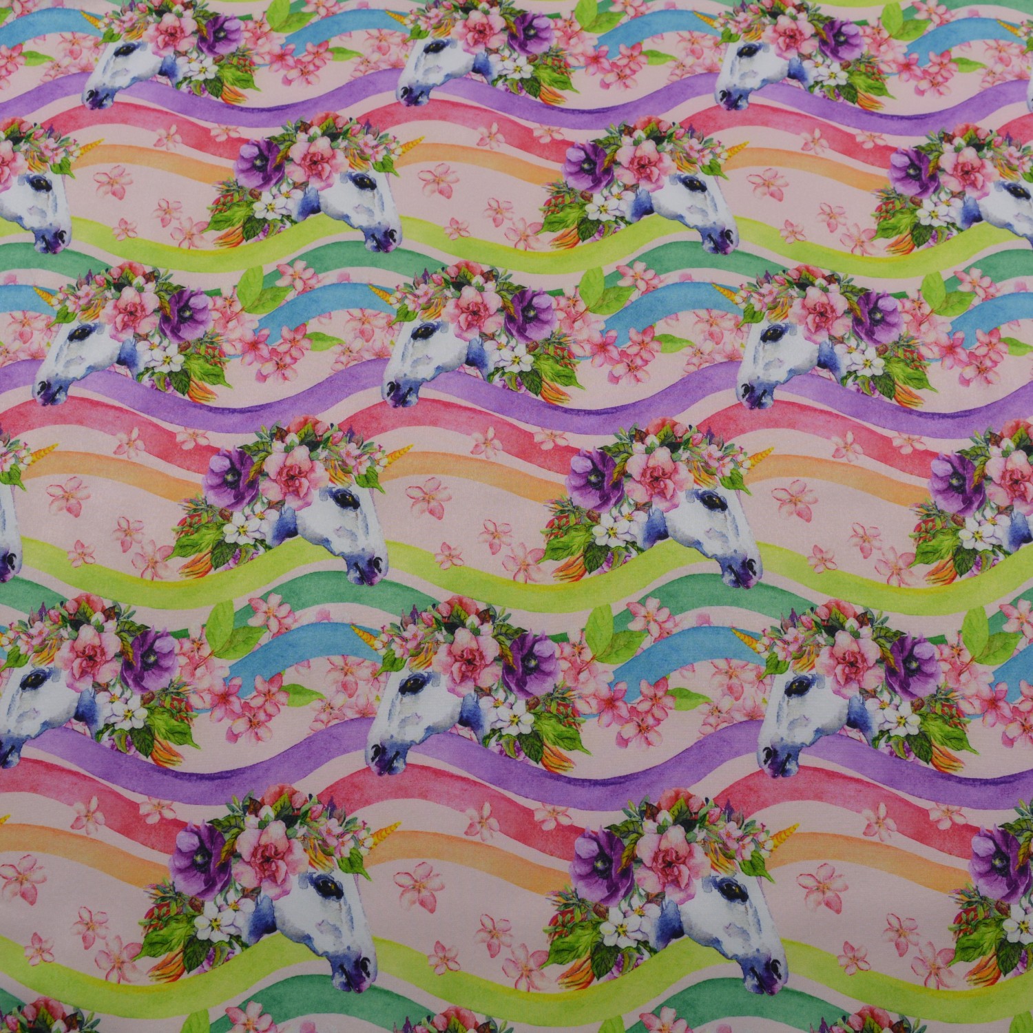 Softshell Stoff – Einhorn- und Blumenmuster in lebendigen Regenbogenfarben