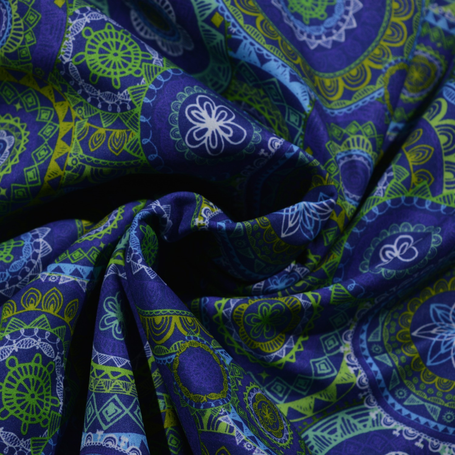 Dieser hochwertige Softshell Stoff präsentiert ein lebendiges Mandala-Muster in intensiven Blau- und Grüntönen, das jedem Nähprojekt ein einzigartiges und farbenfrohes Design verleiht. Das wasserabweisende, winddichte und zugleich atmungsaktive Material aus 100% Polyester eignet sich perfekt für wetterfeste Kleidung wie Jacken, Mäntel oder Outdoor-Accessoires. Mit einer Breite von 145 cm und einem Gewicht von 310 g/m² bietet dieser Stoff die ideale Grundlage für funktionale und kreative Nähprojekte.