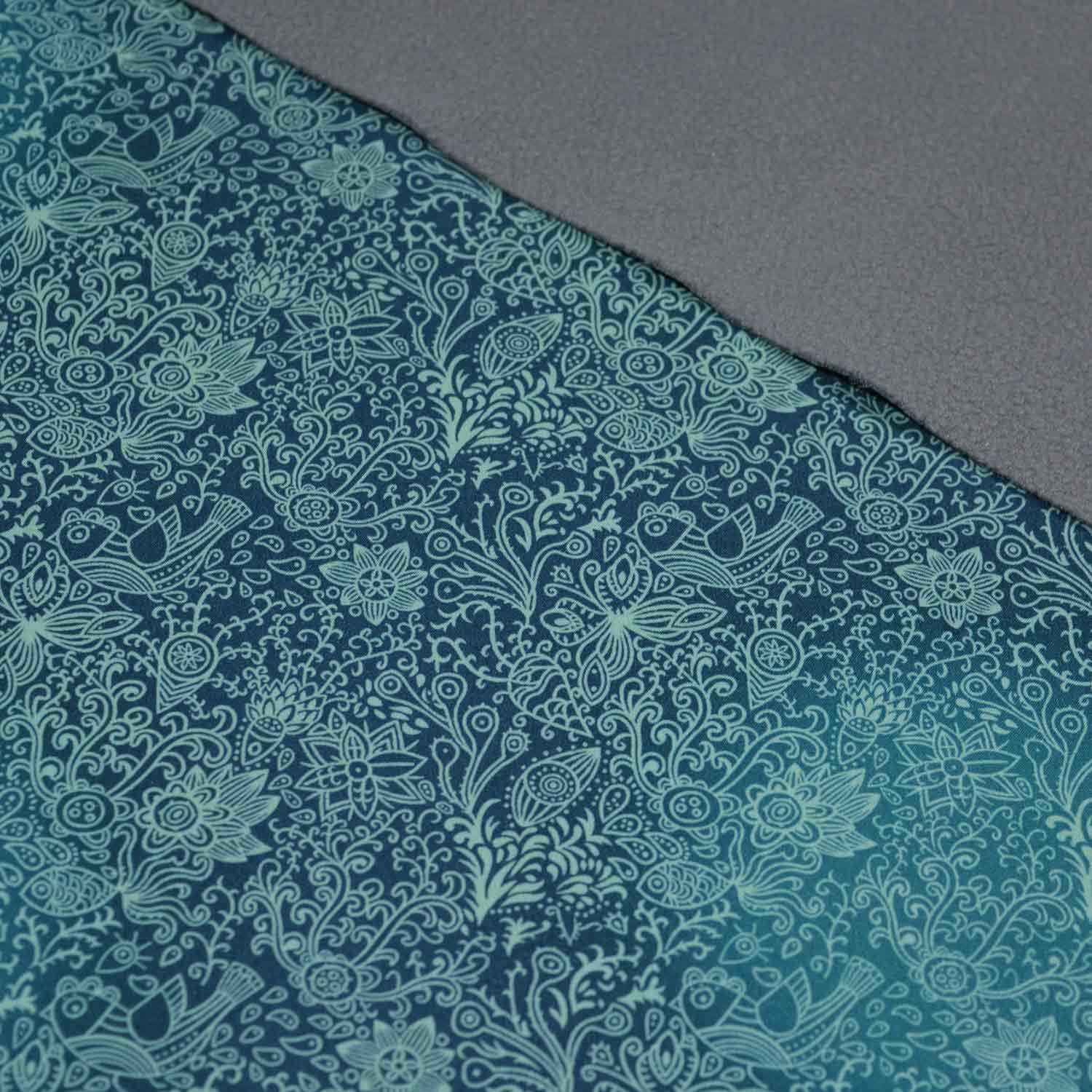 Zauberhafter Softshell mit niedlichem Blumen-Print. Auf dem dunklen, pfauenblauen Untergrund ist ein wahrer Blumenteppich abgebildet. Als würde man von hoch oben auf ein dichtes Gewirr von Bodendeckern blicken. Blütensterne in Hellblau und gelbgrün gemischt mit Polstern von Blüten in verschiedenen Formen und Farben im Spektrum von Mint über Blau zu Gelbgrün. Ein wunderschönes Dessin, blumig aber überhaupt nicht kitschig. Die flauschige Abseite ist neutral dunkelgrau gefärbt.