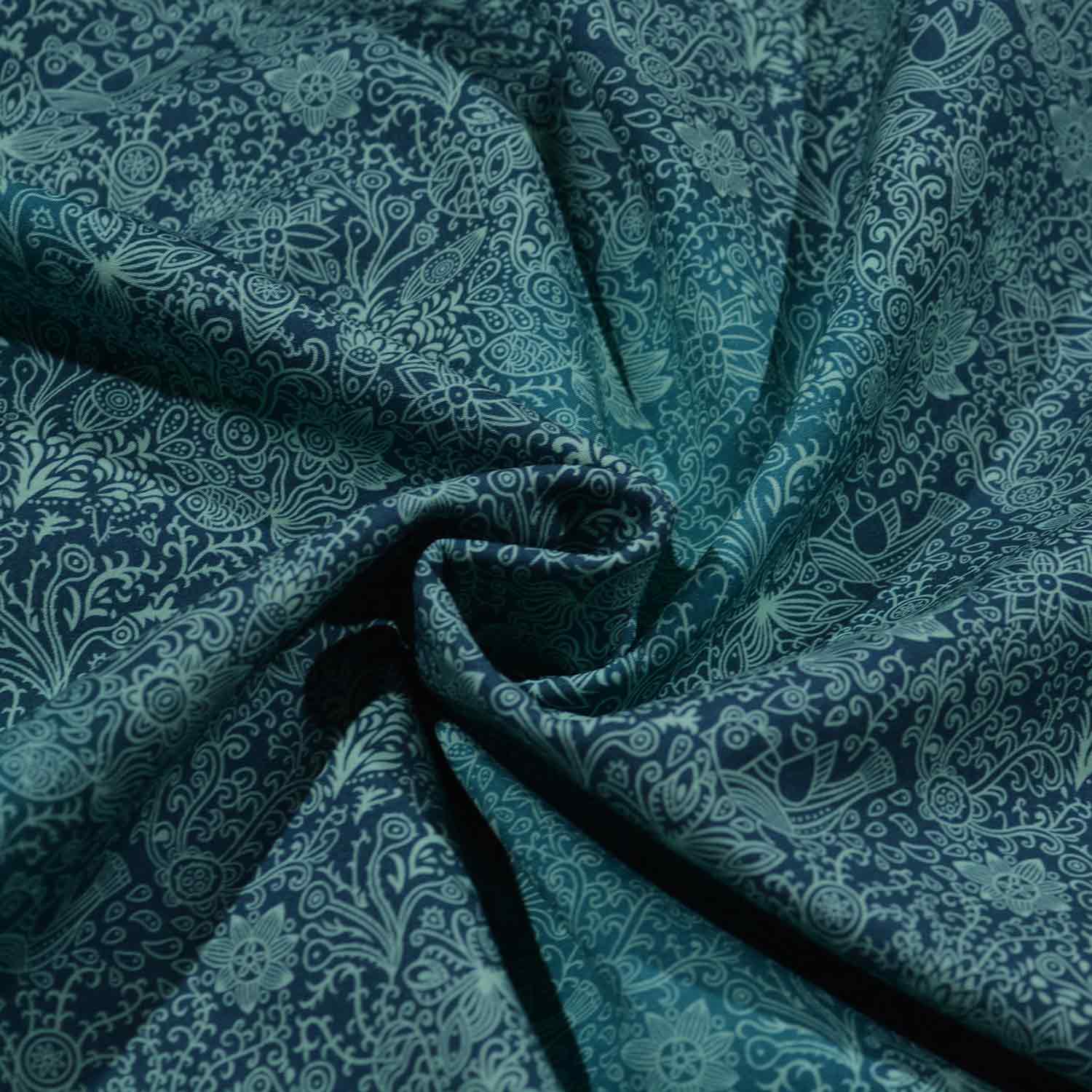 Spotlight ist ein weicher Baumwoll Jersey in einem satten dunkelblau und mit einem zarten floralen Muster in einem leuchtenden pfauenblau bedruckt. In regelmäßigen Abständen wird der Stoff wie mit kleinen Scheinwerfern - Spotlights - kreisförmig aufgehellt zu Akzenten in türkis und hellblau.