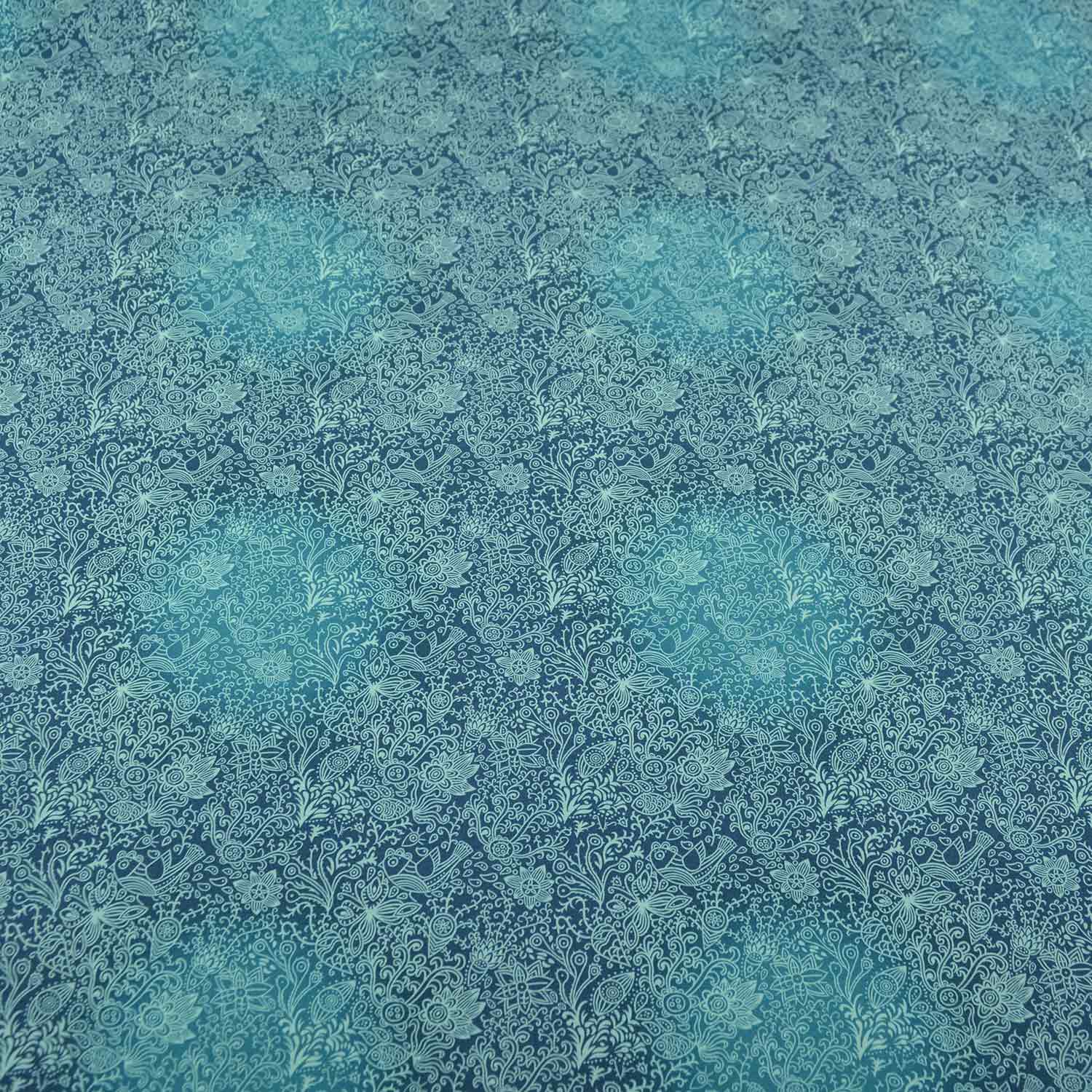Ein zauberhaftes Baumwoll-Jersey Dessin auf blauem Untergrund.Zarte Blumen der verschiedensten Arten schweben hier in Farbverläufen von Hell- nach Himmelblau als duftige Schemen über den Stoff.Die traumhafte Szenerie wird analog zum Dessin Spotlight in regelmäßigen Abständen kreisförmig aufgehellt, ohne der mysteriösen Athmosphäre einen Abbruch zu tun.