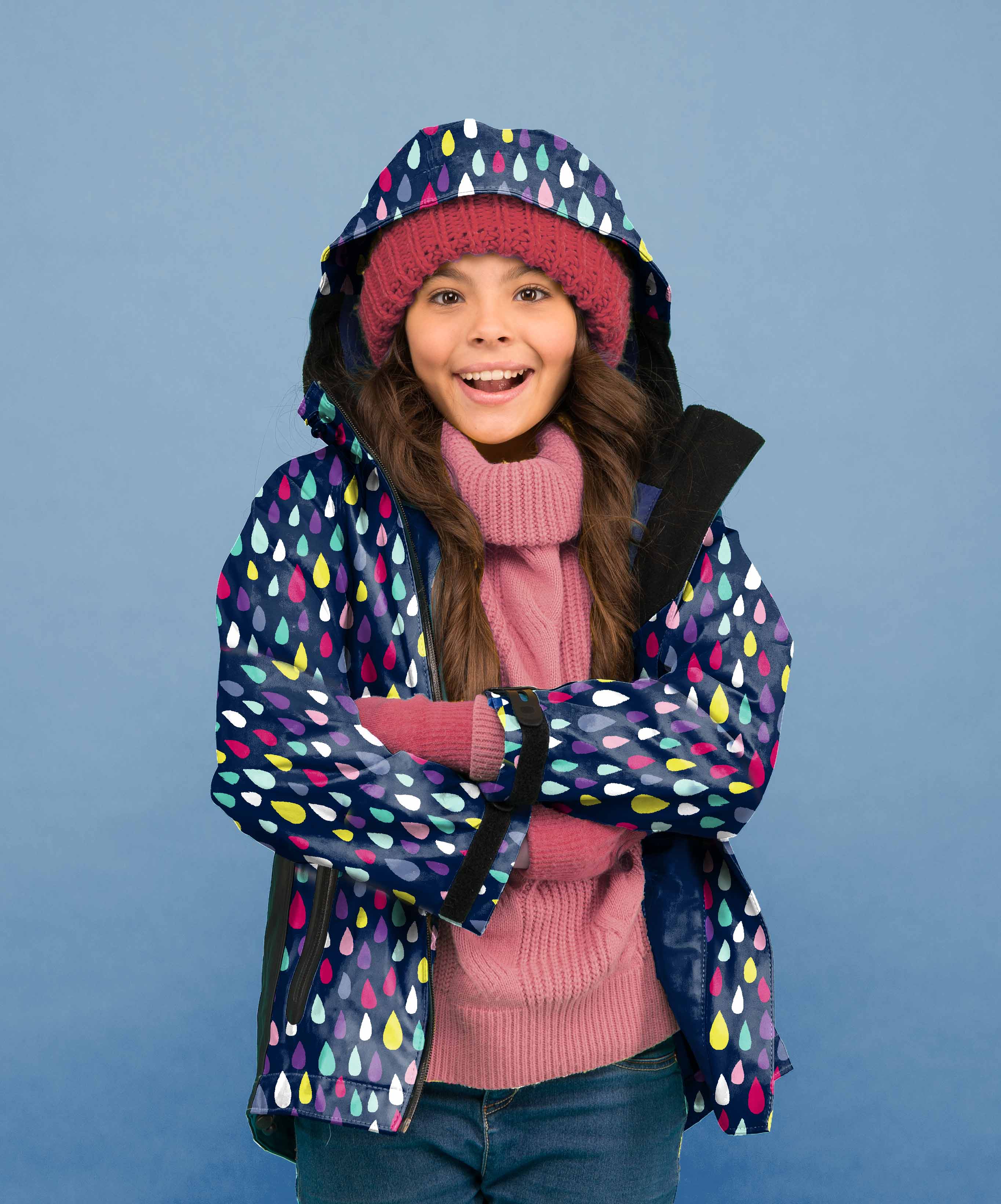 Auf den altrosa Untergrund dieses Softshells sind bunte Regentropfen und Sterne in verschiedenen Grüßen gedruckt.Die flauschige Abseite ist ebenfalls altrosa.