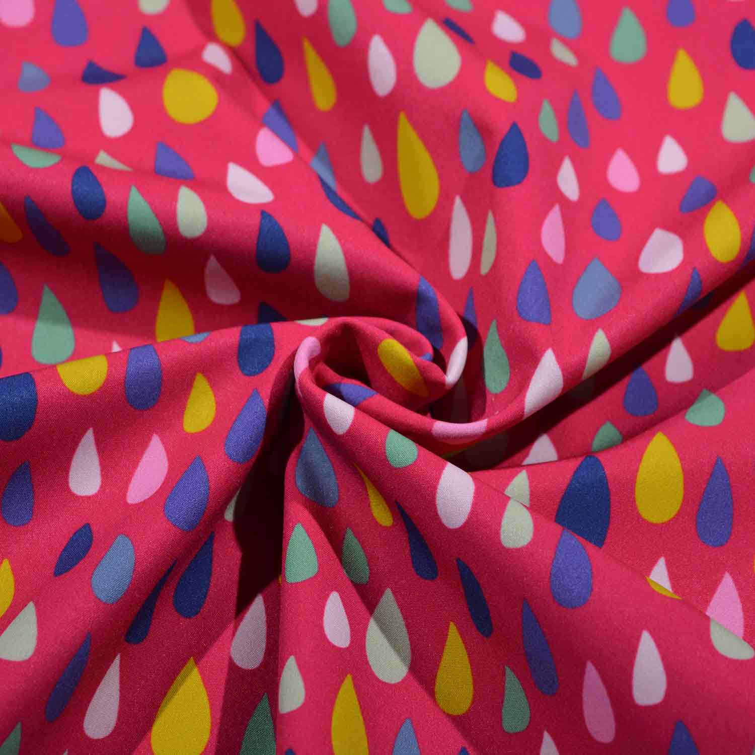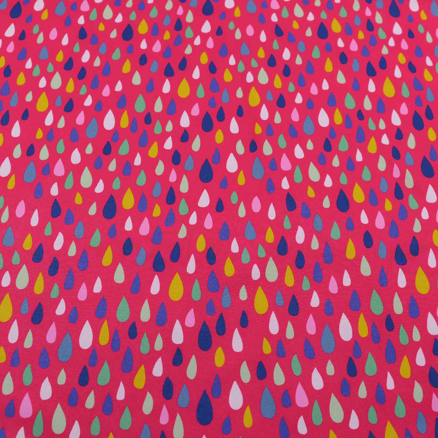 Softshell in zartem rosa mit einem Aufdruck von glänzenden Wassertropfen in verschiedenen Größen, die mit einem tollen 3D-Effekt versehen sind und daher recht realistisch aussehen.Die flauschige Abseite des Stoffs ist ebenfalls hellrosa getönt.Dieses Dessin gibt es noch in weiteren Farben.