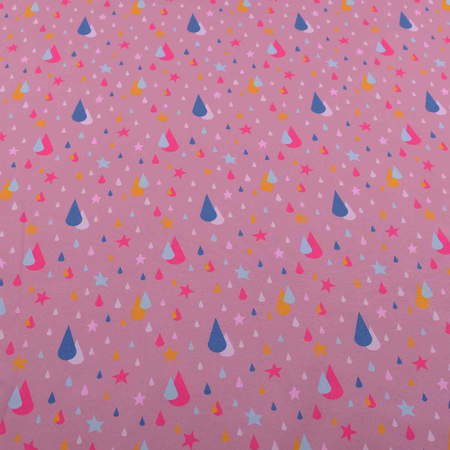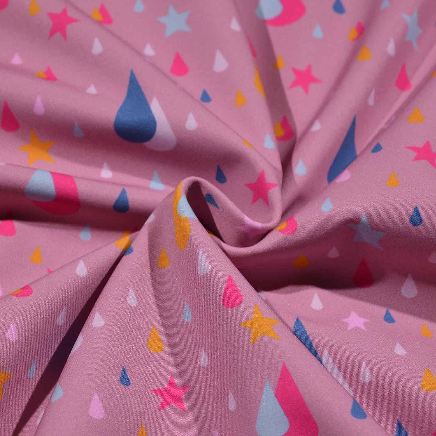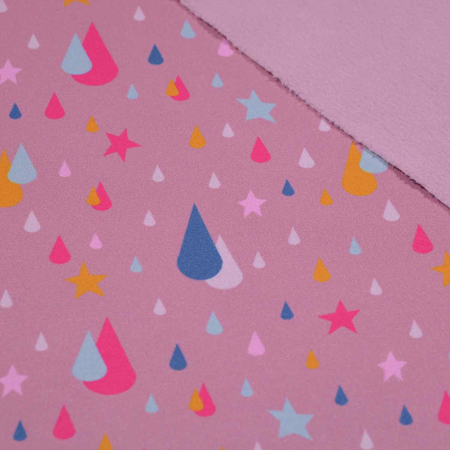 Softshell in zartem rosa mit einem Aufdruck von glänzenden Wassertropfen in verschiedenen Größen, die mit einem tollen 3D-Effekt versehen sind und daher recht realistisch aussehen.Die flauschige Abseite des Stoffs ist ebenfalls hellrosa getönt.Dieses Dessin gibt es noch in weiteren Farben.