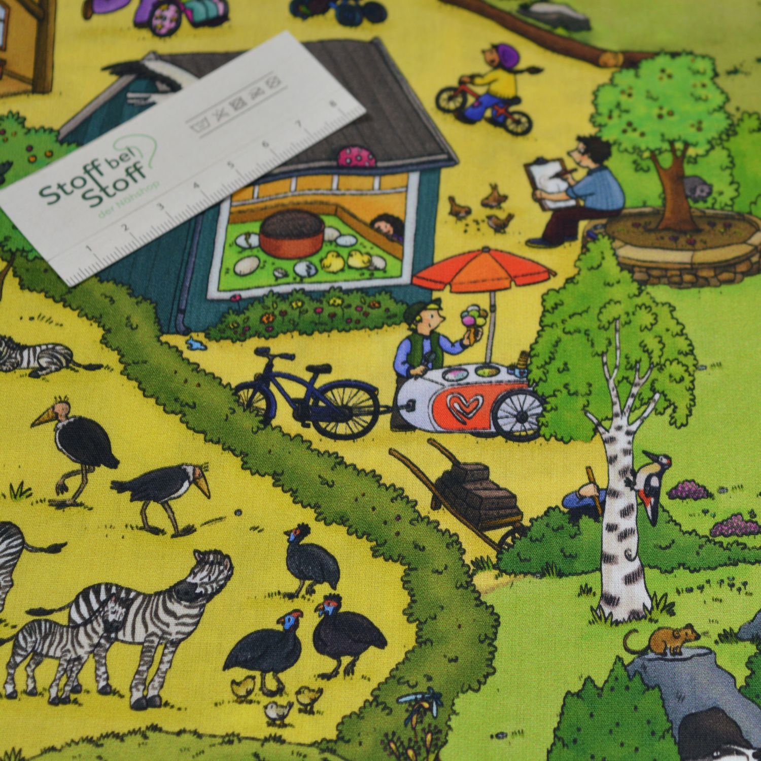 Willkommen im faszinierenden Tierpark Wimmelbuch! Tauchen Sie ein in eine farbenfrohe und lebendige Welt voller Abenteuer und Entdeckungen. Die Baumwollwebware mit dem Tierpark Wimmelbuch-Motiv entführt Sie in eine bezaubernde Szenerie, in der verschiedene Tiere sowie glückliche Familien und neugierige Kinder eine harmonische Atmosphäre schaffen.Das Motiv des Tierpark Wimmelbuchs ist voller Leben und zeigt eine Vielzahl von Tieren, die in ihrem natürlichen Lebensraum agieren. Von stolzen Straußen über elegante Zebras bis hin zu niedlichen Kaninchen und frechen Füchsen - diese Stoffbahn erzählt eine fesselnde Geschichte über das Miteinander von Mensch und Tier im Tierpark.Die bunten Hühner picken neugierig auf dem Boden, während Störche majestätisch durch die Lüfte gleiten. Sanfte Schafe grasen in friedlicher Eintracht neben den beeindruckenden Bisons. Überall flattern Tauben und vervollständigen die lebendige Szenerie dieses zauberhaften Stoffes.Die Baumwollwebware eignet sich perfekt für die Herstellung von Kinderbekleidung, Bettwäsche, Kissenbezügen, Vorhängen und vielen anderen Nähprojekten. Das liebevoll gestaltete Motiv wird nicht nur die Kleinen begeistern, sondern auch die Herzen von Eltern und Großeltern höher schlagen lassen.Erwecken Sie Ihre Nähprojekte zum Leben und lassen Sie die Abenteuer des Tierpark Wimmelbuchs in Ihr Zuhause einziehen. Schaffen Sie einzigartige Unikate für Ihre Liebsten und bringen Sie die Freude und Schönheit der Natur in Ihre Nähkreationen. Tauchen Sie gemeinsam mit Ihren Kindern, Eltern und Großeltern in die farbenfrohe Welt dieses besonderen Stoffes ein und erleben Sie unvergessliche Nähmomente!