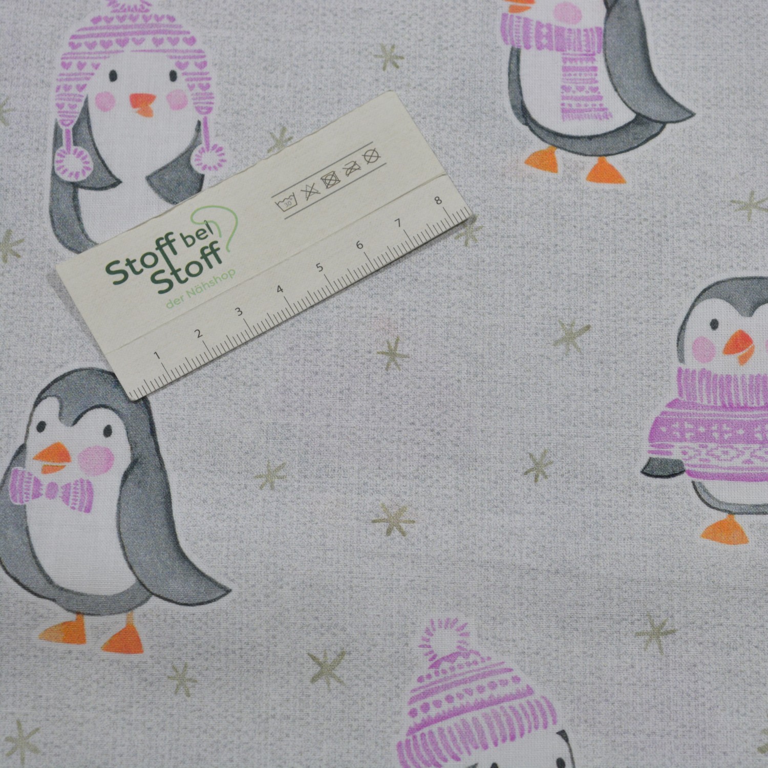 Baumwollstoff mit niedlichem Pinguin-Wintermotiv – Perfekt für kuschelige und kreative NähprojekteDieser charmante Baumwollstoff begeistert mit einem winterlichen Design aus fröhlichen Pinguinen, die liebevoll mit lilafarbenen Mützen, Schals und Fliegen ausgestattet sind. Der dezente, graue Hintergrund mit feinen goldenen Schneeflocken verleiht dem Stoff eine warme und gemütliche Atmosphäre. Das Bild zeigt die niedlichen Motive in harmonischen Farben, die ideal für Kinderbekleidung und winterliche Dekorationen geeignet sind.Die 100% Baumwolle sorgt für eine angenehme, hautfreundliche Haptik und Atmungsaktivität. Mit einer Breite von 140 cm und einem Gewicht von 110 g/m² eignet sich der Stoff perfekt für Nähprojekte wie Kinderkleidung, Schlafanzüge, Kissenhüllen oder Dekorationen für die kalte Jahreszeit.