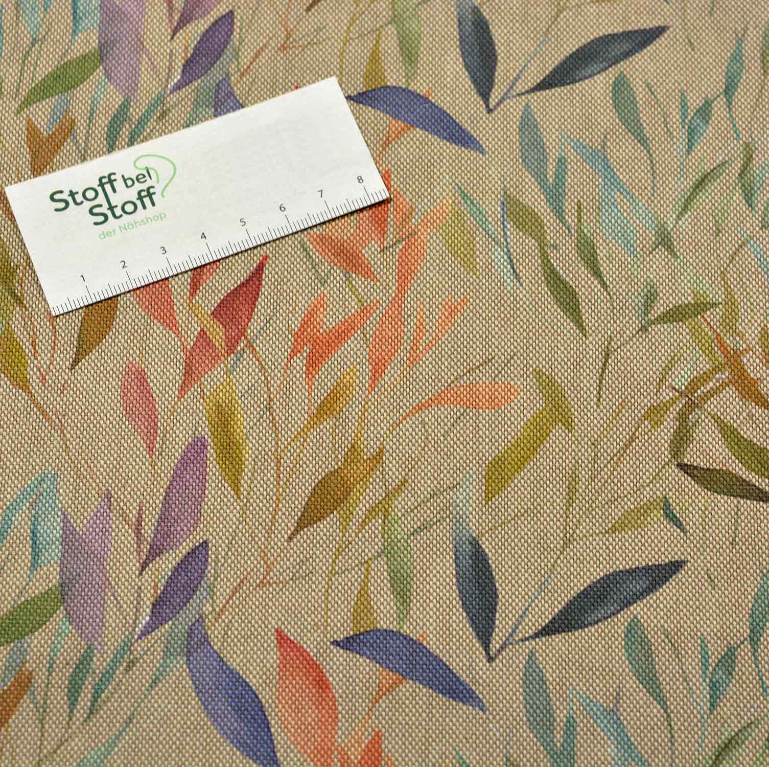 Die Grundlage für diesen wunderbaren Deko-Stoff ist eine ungefärbte Baumwolle mit leichtem Polyester-Anteil. Bedruckt ist der naturfarbene Stoff mit zauberhaft gefiederten Blättern junger Bambus-Triebe. Gefärbt sind die Blätter in allen möglichen Farben. Manche Wedel sind dunkelblau, es gibt welche in grün und violett, in orange und rost und vielen anderen Farbtönen. Die Blätter in ihrer leichten, fedrigen Struktur und die sanften, harmonischen Farben sind eine wunderschöne Komposition für ausgewogene, harmonische Deko-Projekte.