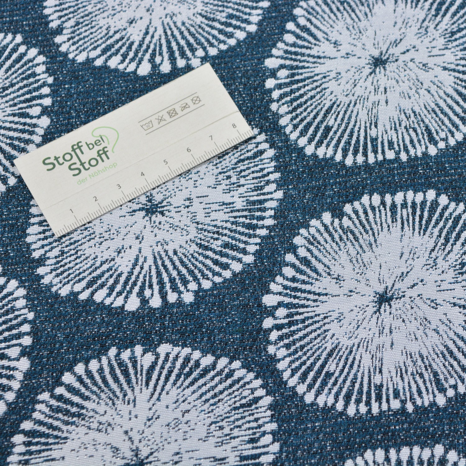 Der Deko Jacquard Stoff "Türkise Pusteblume" bringt frische Eleganz in Ihre Wohnräume. Mit einem modernen Design von weißen Pusteblumen-ähnlichen Kreisen auf einem lebhaften türkisfarbenen Hintergrund, verleiht dieser Stoff jedem Raum eine lebendige und stilvolle Note. Der Stoff besteht aus 60% Polyester und 40% Baumwolle, was ihm sowohl Robustheit als auch eine angenehme Textur verleiht. Mit einer Breite von 140 cm und einem Gewicht von 220 g/m² ist dieser Jacquard-Stoff perfekt für dekorative Anwendungen wie Vorhänge, Kissenbezüge, Tischläufer und Polsterarbeiten.