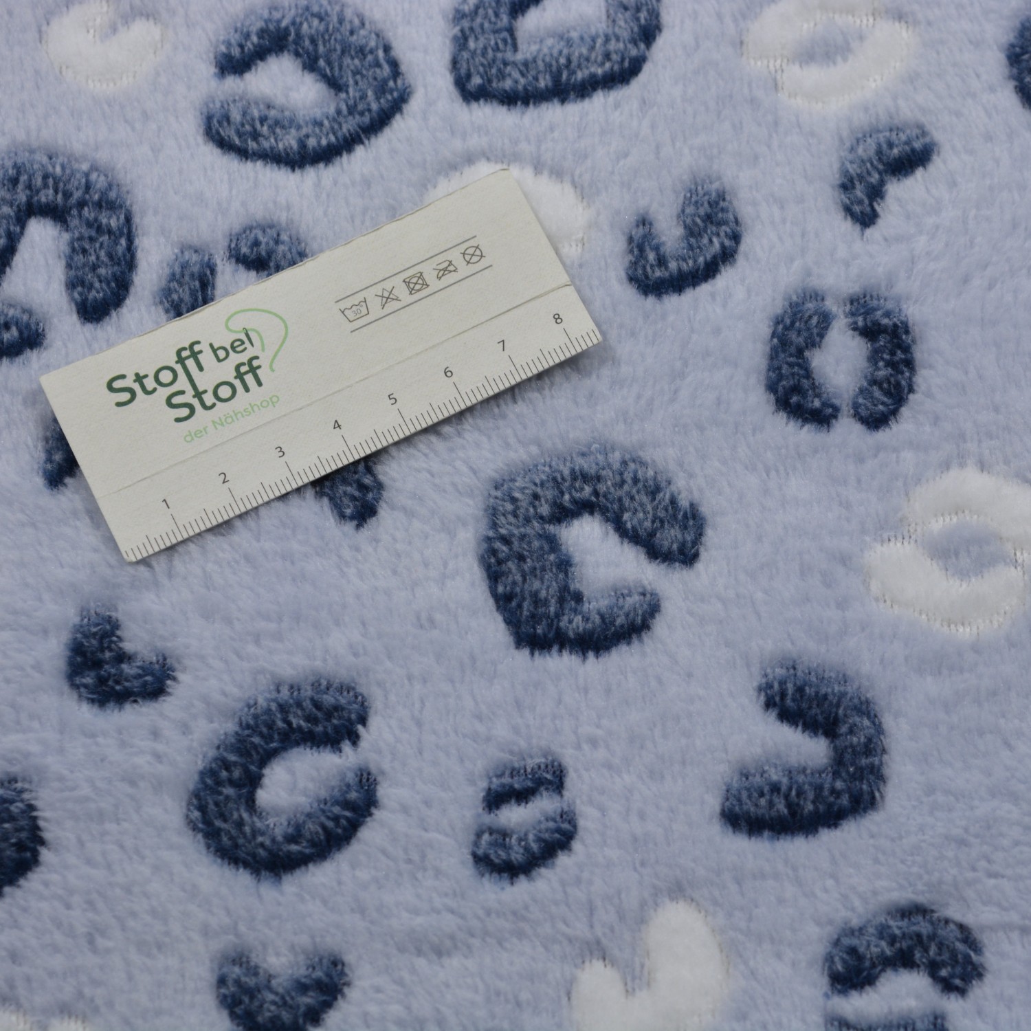 Microfleece – Leopard-Print in Blau & WeißDieser kuschelig weiche Microfleece-Stoff mit trendigem Leopard-Print in Blau und Weiß bietet höchsten Tragekomfort und wohlige Wärme. Hergestellt aus 100% Polyester, ist er leicht, atmungsaktiv und schnelltrocknend. Die Breite von 150 cm und das Gewicht von 250 g/m² machen ihn ideal für Pullover, Decken, Mützen, Schals oder kuschelige Kinderbekleidung. Perfekt für kreative Projekte mit einem Hauch von Wildnis!