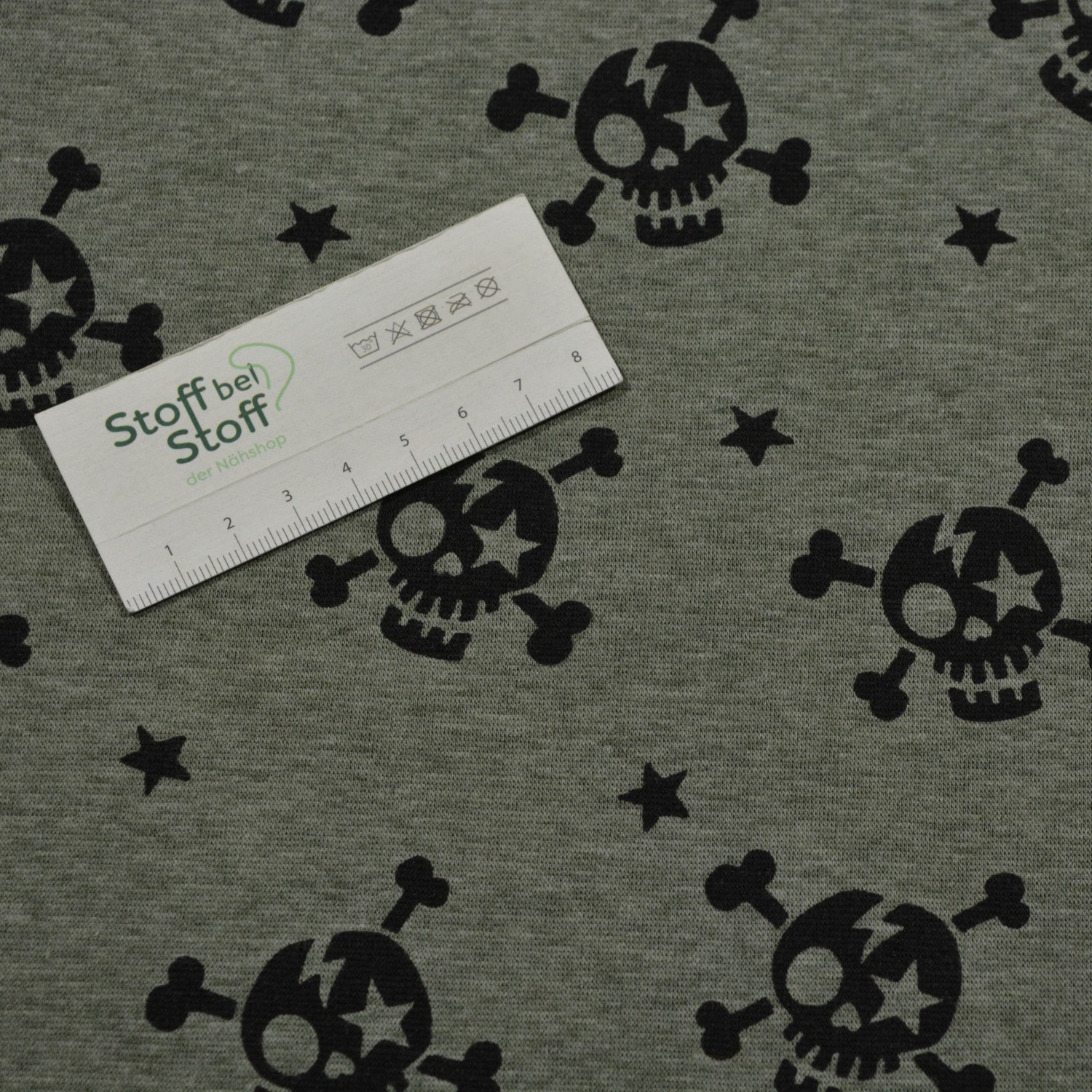 Alpenfleece Stoff – Olivgrün mit Totenköpfen und SternenDieser Alpenfleece Stoff ist ein echter Hingucker mit seinem coolen Totenkopf- und Sternenmuster auf olivgrünem Hintergrund. Die Kombination aus 56% Polyester, 40% Baumwolle und 4% Elasthan sorgt für eine kuschelige Innenseite und macht den Stoff angenehm elastisch und strapazierfähig. Mit einer Breite von 150 cm und einem Gewicht von 320 g/m² eignet sich dieser Stoff ideal für wärmende Kleidung wie Hoodies, Jacken oder Pullover sowie für kreative Accessoires. Perfekt für alle, die einen auffälligen und zugleich bequemen Stoff suchen!