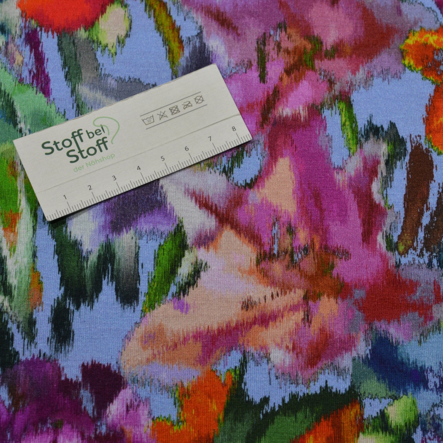Viskose-Jersey mit abstraktem Blumenmuster – Für modische und auffällige ProjekteDieser Viskose-Jersey beeindruckt mit einem lebhaften und abstrakten Blumenmuster in intensiven Farben. Die Motive, in kräftigem Pink, Rot, Blau und Grün gehalten, verteilen sich harmonisch auf dem gesamten Stoff. Das Bild zeigt die farbenfrohe Vielfalt der verspielten Blumen, die für auffällige, modische und kreative Kleidungsstücke sorgen.Mit einem Materialanteil von 96% Viskose und 4% Elasthan bietet der Stoff eine hervorragende Elastizität und ein fließendes Tragegefühl. Die Breite von 164 cm und das Gewicht von 200 g/m² machen diesen Stoff ideal für Projekte wie Sommerkleider, Röcke, T-Shirts oder Tuniken. Durch die atmungsaktive und hautfreundliche Viskose fühlt sich der Stoff angenehm leicht und geschmeidig auf der Haut an.