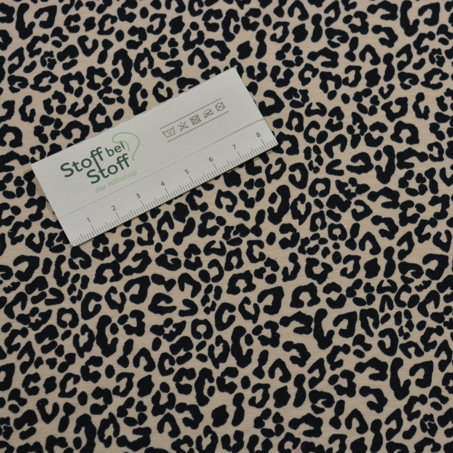 Baumwolljersey mit stilvollem Leopardenmuster – Für trendige und bequeme ModeDieser hochwertige Baumwolljersey besticht durch sein elegantes Leopardenmuster in Schwarz auf einem beigefarbenen Hintergrund. Das Bild zeigt die gleichmäßig verteilten Leopardenflecken, die dem Stoff eine modische und zugleich zeitlose Ausstrahlung verleihen. Perfekt geeignet für trendige Kleidungsstücke wie Leggings, Shirts, Kleider oder Accessoires, lässt sich dieser Stoff vielseitig kombinieren und verleiht jedem Outfit einen Hauch von Wildheit und Eleganz.Der Stoff besteht aus 95% Baumwolle und 5% Elasthan, was eine optimale Mischung aus angenehmer Atmungsaktivität, Elastizität und Tragekomfort bietet. Mit einer Breite von 150 cm und einem Gewicht von 200 g/m² ist dieser Jersey stabil, aber dennoch weich und flexibel. Er ist ideal für modische Projekte, bei denen Komfort und Stil im Vordergrund stehen.