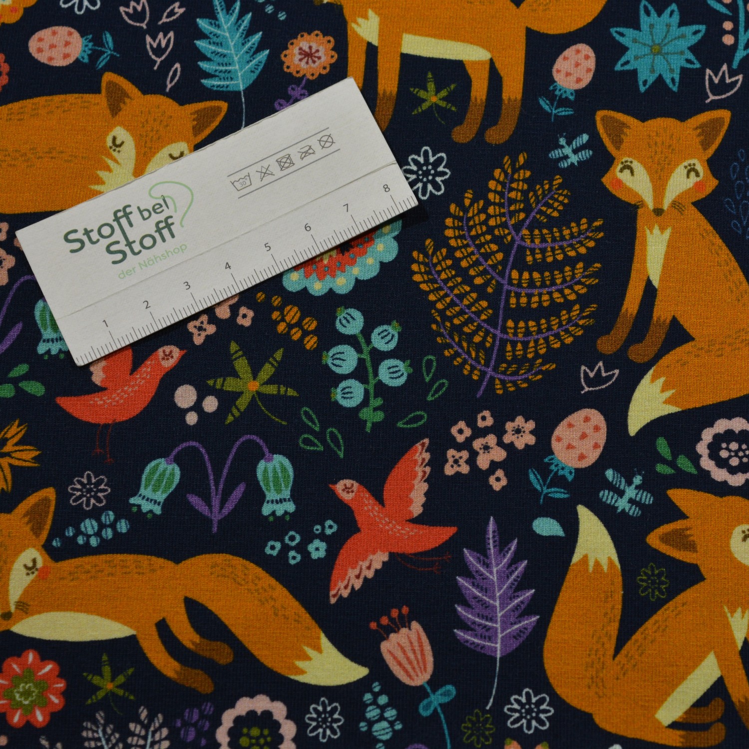 Baumwolljersey mit verspieltem Fuchsmuster – Perfekt für kreative NähprojekteDieser hochwertige Baumwolljersey überzeugt mit einem fantasievollen Design aus orangefarbenen Füchsen, die sich auf einem dunkelblauen Hintergrund harmonisch zwischen bunten Blumen, Blättern und Vögeln tummeln. Das Stoffbild zeigt detailreich gestaltete Motive, die eine lebendige und gleichzeitig beruhigende Waldszene nachbilden. Die farbigen Elemente wie Blumen in Gelb, Blau und Rosa sowie kleine Vögel setzen frische Akzente und bringen den Stoff zum Strahlen.Dank der Materialzusammensetzung von 95% Baumwolle und 5% Elasthan bietet der Stoff eine angenehme Elastizität und hohen Tragekomfort. Mit einer Breite von 150 cm und einem Gewicht von 200 g/m² ist dieser Jersey-Stoff vielseitig einsetzbar – ob für bequeme T-Shirts, Kinderkleidung, Leggings oder Accessoires wie Mützen und Schals. Die natürliche Atmungsaktivität der Baumwolle und der leichte Stretch-Anteil machen ihn perfekt für den Alltag.