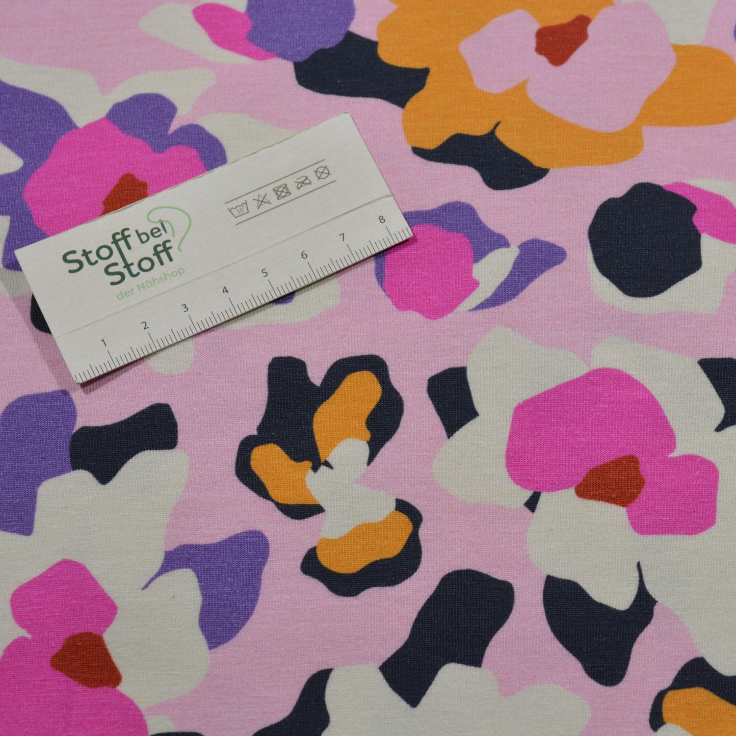Baumwoll Jersey – Florales Muster in Pink, Lila & Orange auf RosaDieser hochwertige Baumwoll Jersey begeistert mit einem ausdrucksstarken floralen Design in Pink, Lila, Orange und Schwarz auf einem sanften rosa Hintergrund. Der Stoff ist aus 95% Baumwolle und 5% Elasthan gefertigt, wodurch er angenehm weich, atmungsaktiv und dehnbar ist. Mit einer Breite von 150 cm und einem Gewicht von 200 g/m² eignet er sich perfekt für modische Shirts, Kleider, Leggings oder Kinderbekleidung. Ein trendiger Stoff für alle, die kräftige Farben und moderne Blumenmuster lieben!