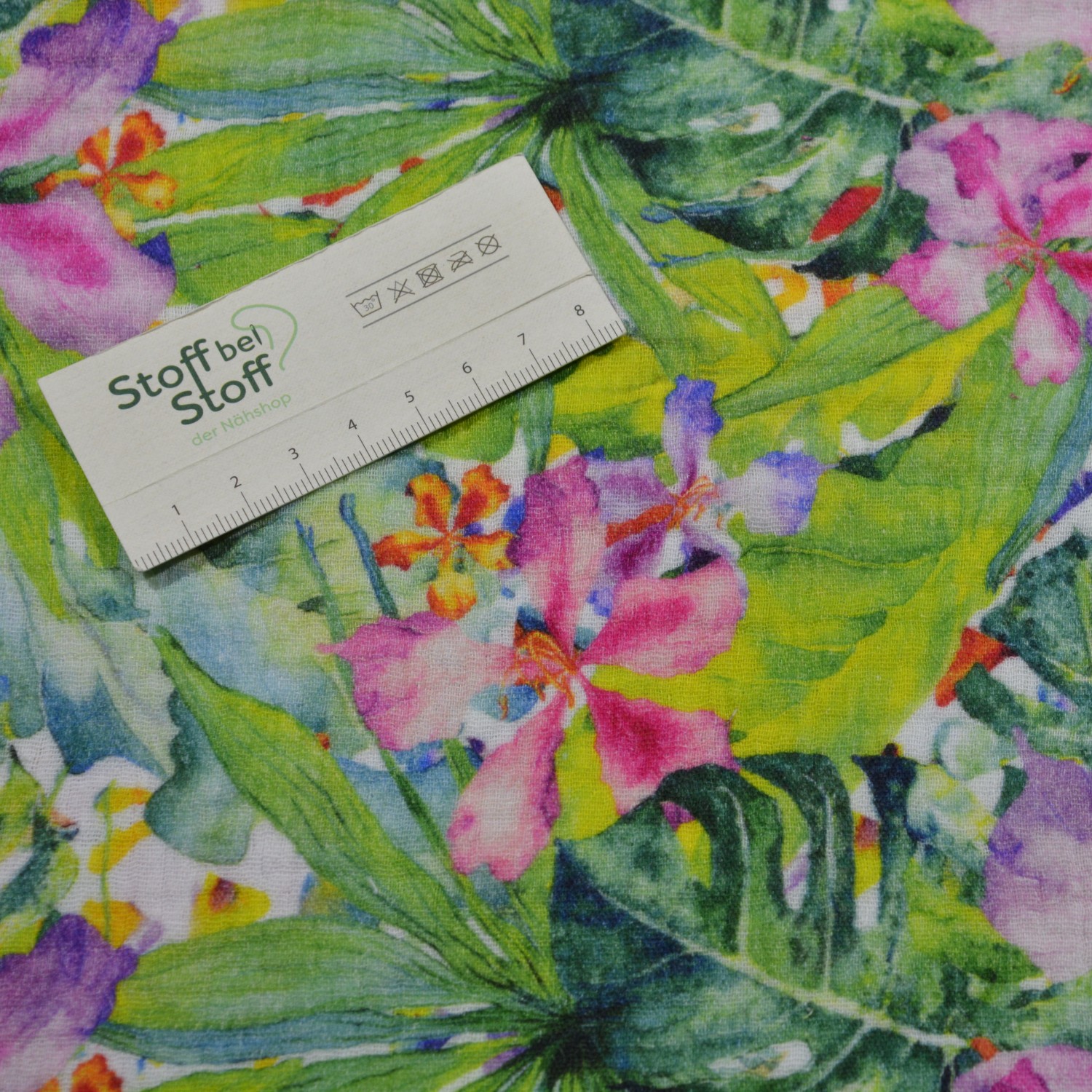 Musselin – Tropisches BlumenmusterDieser atemberaubende Musselin besticht durch sein tropisches Design mit leuchtenden Hibiskusblüten und Monstera-Blättern in kräftigen Farben. Hergestellt aus 100% Baumwolle, bietet er eine angenehme Haptik, ist atmungsaktiv und vielseitig einsetzbar. Mit einer Breite von 140 cm und einem Gewicht von 110 g/m² eignet er sich ideal für sommerliche Blusen, Kleider, Röcke sowie dekorative Heimtextilien wie Vorhänge oder Kissen. Perfekt für alle, die exotische Muster lieben!