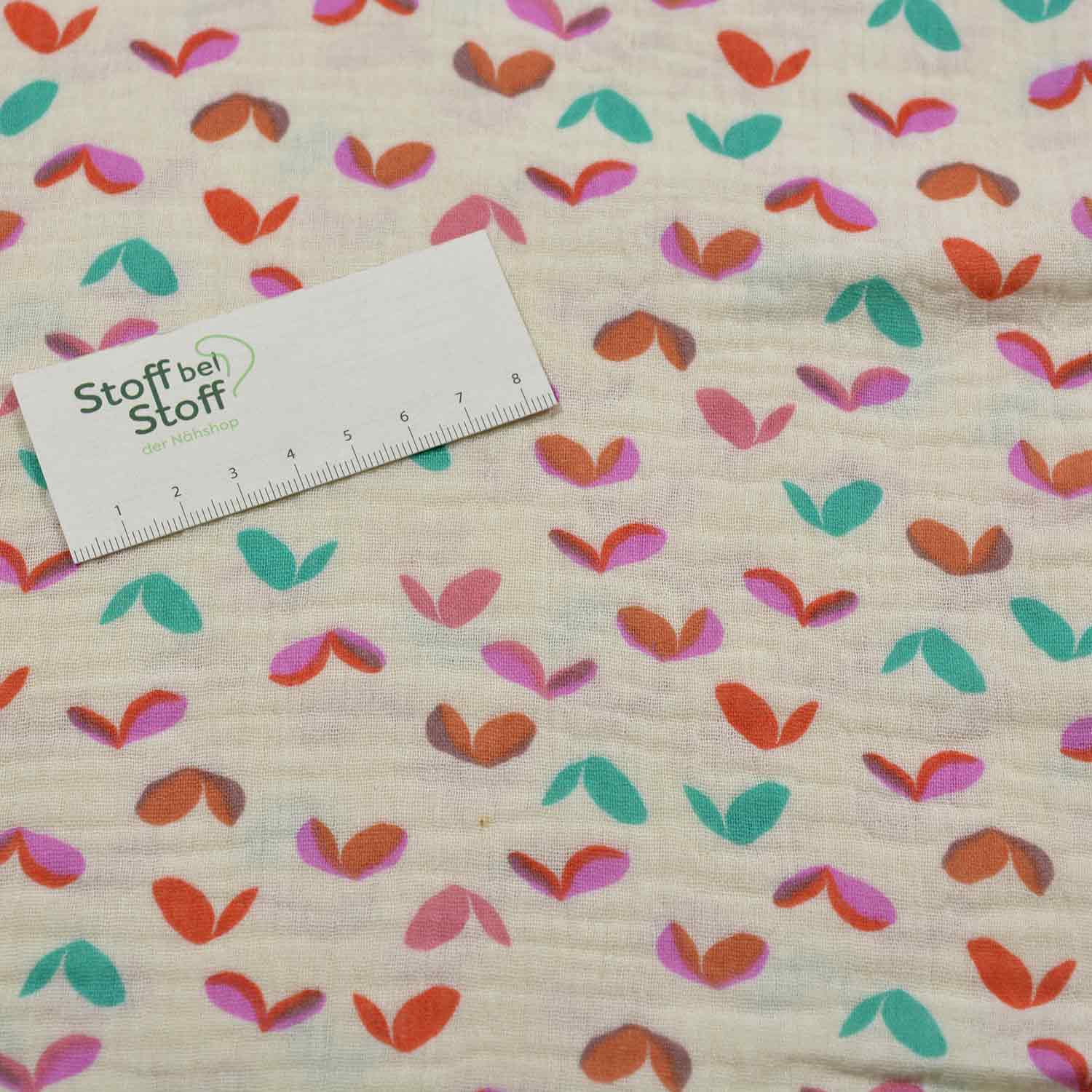 Weicher, heller Musselin mit wunderschönem Frühlings-Print. Der weiße Untergrund ist mit kleinen Blumen und Blättern bedruckt, die kreuz und quer über den Stoff verteilt sind. Wunderschönes Frühlings-Dessin für Groß und Klein. Sowohl Kinder- und Babykleidung als auch originelle Kleider, Blusen und Tuniken für Damen lassen sich toll aus dem Allrounder Musselin fertigen. Auch als Schal oder Dreieckstuch ist das Material beliebt.