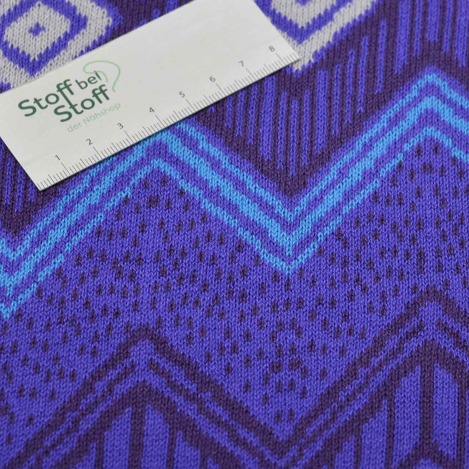 Kuschelweicher Baumwollstrick mit einem Blockstreifen und Kreuzen in verschiedenen Farben.Da es sich um einen Jacquard handelt hat jede Seite des Stoffs drei Farben: Bei diesem Strick ist die Grundfarbe lila mit gelbgrünen Blockstreifen. Auf beiden Grundfarben sind mintgrüne Kreuze angeordnet, als hätte man eine Kreuzstich-Stickerei nach einer Vorlage aufgebracht.Die Unterseite des Jacquards ist komplett mint. Aber die Kreuzstich-Kreuze sind lila und gelbgrün, gegengleich zu den Streifen auf der Oberseite.Das originelle Dessin gibt es in mehreren Farben.
