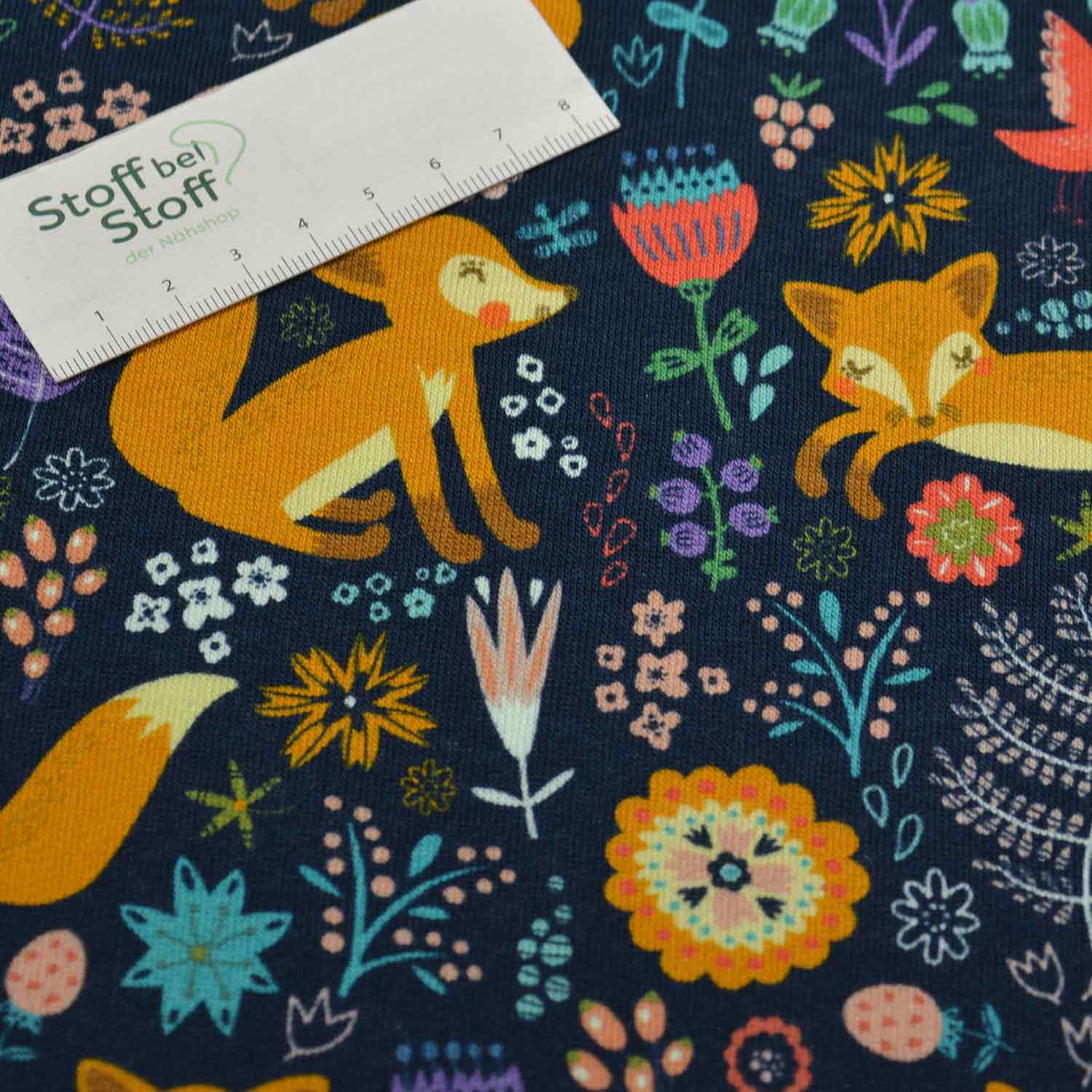 Wunderschöner, flauschiger Sweat in marineblau mit kuscheliger, weißer Abseite.Bedruckt ist der Stoff mit dem aller schönsten Fuchs-im-Wald-Motiv. Zwischen allen möglichen, phantasievoll gestalteten Blumen und Farnen halten kleine, orangegelbe Füchse ein Schläfchen, schnuppern an Blumen, stehen, laufen und springen und genießen offenbar ihr Leben. Zumindest der zufriedene Gesichtsausdruck der Füchschen lassen darauf schließen.Ein ausgesprochen liebenswerter Stoff mit entzückendem Wald-Feeling.