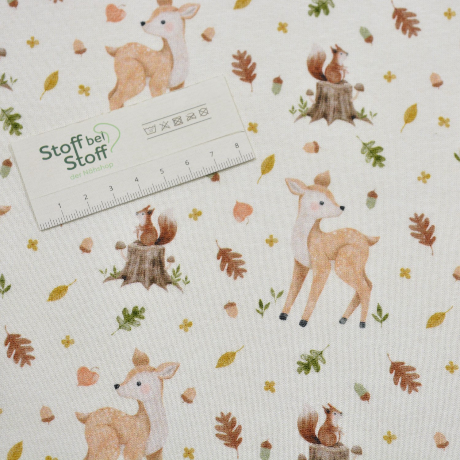 Der Sweatstoff "Dina" ist ein bezaubernder Stoff, der die Schönheit des Waldes in Ihr Zuhause bringt. Dieser weiche und angenehme Sweatstoff besteht aus 65% Baumwolle und 35% Polyester, was ihn besonders komfortabel und gleichzeitig langlebig macht. Mit einem Gewicht von 280 g/m² und einer Breite von 150 cm ist er perfekt für eine Vielzahl von Nähprojekten, die Wärme und Gemütlichkeit bieten sollen. Das Design zeigt niedliche Waldtiere wie ein Rehkitz und ein Eichhörnchen, das auf einem Baumstumpf sitzt, umgeben von liebevoll gestalteten Details wie Eicheln, Blättern und Pilzen auf einem hellen Untergrund. Dieser Stoff eignet sich hervorragend für Kinderbekleidung, kuschelige Pullover, Decken und dekorative Accessoires.