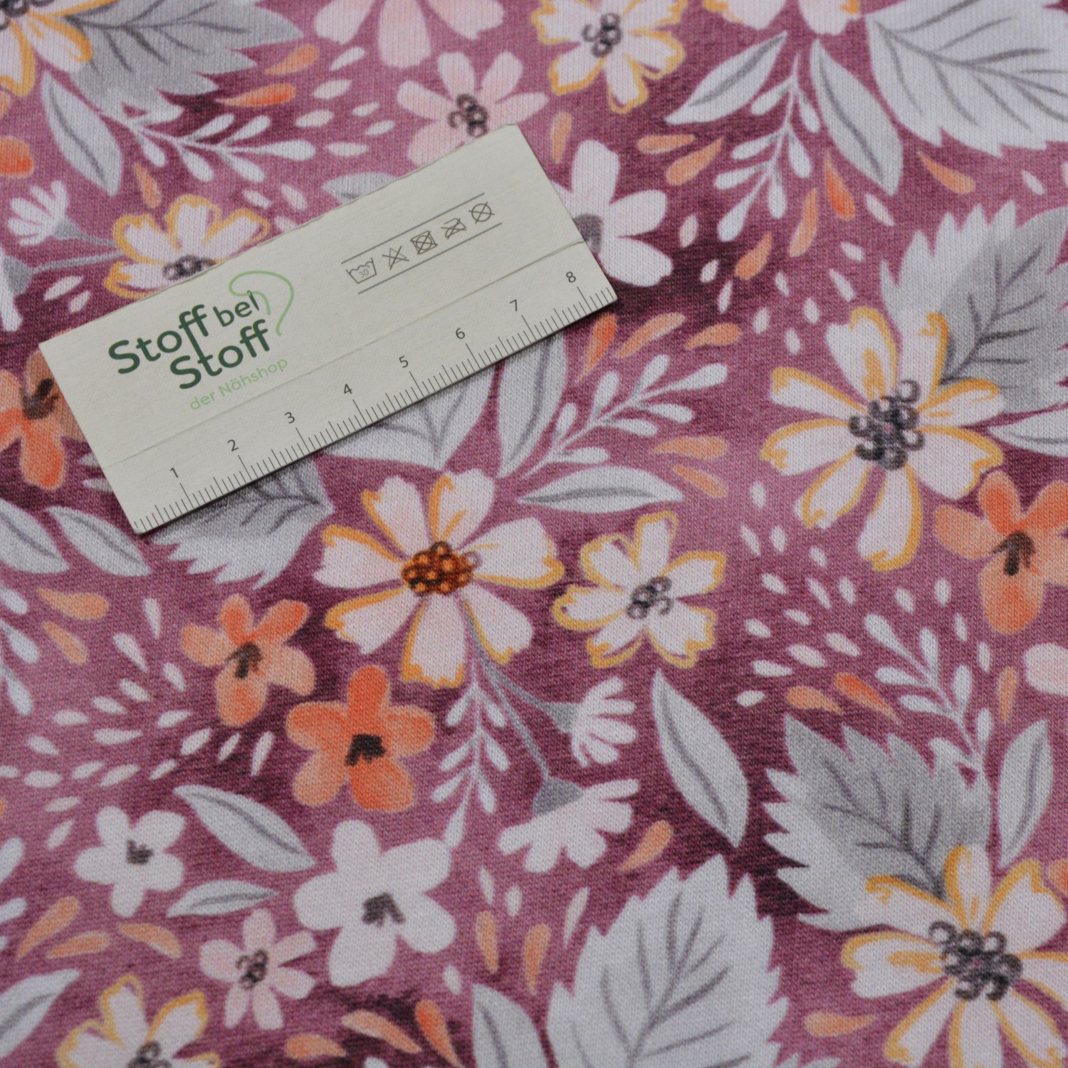 Sweatstoff – Blumenmuster auf AltrosaDieser wunderschöne Sweatstoff begeistert mit einem romantischen Blumenmuster auf altrosa Hintergrund. Die Kombination aus 90% Baumwolle und 10% Polyester sorgt für ein angenehmes Tragegefühl und macht den Stoff gleichzeitig strapazierfähig und pflegeleicht. Mit einer Breite von 155 cm und einem Gewicht von 285 g/m² ist dieser Sweat ideal für gemütliche Hoodies, Sweatshirts, Kleider oder Jogginghosen. Perfekt für stilvolle Nähprojekte mit floralem Charme!