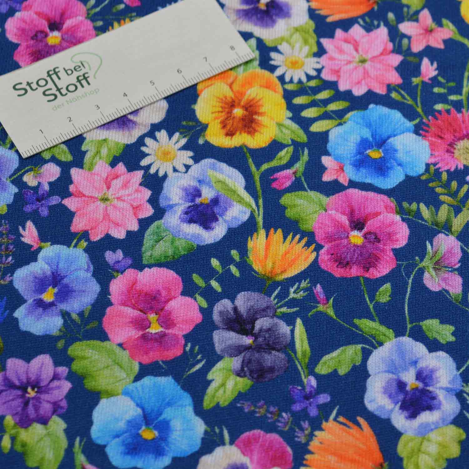 Wunderschöner, flauschiger Sweat mit klassischem, dunkelblauem Untergrund.Bedruckt ist der der Stoff mit üppigen Gartenblumen. Bunte Stiefmütterchen und Hornveilchen mischen sich mit Margeriten und Kornblumen und ergeben ein wunderbar frisches, fröhliches Bild.Freundlicher Blumenstoff auf blauem Grund, farbenfroh und frisch, wie die Blüten die darauf abgebildet sind.