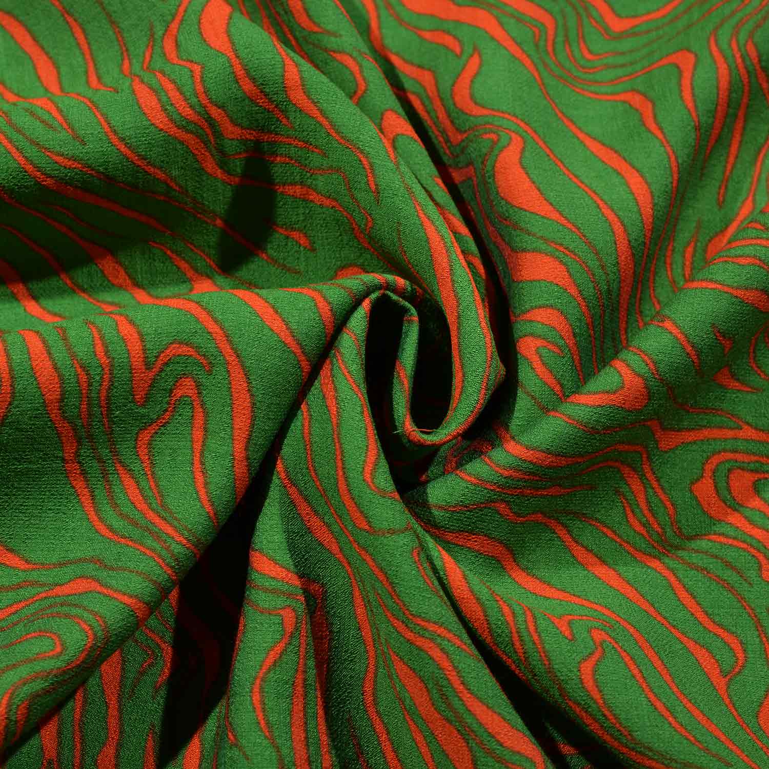 Das abstrakte Schlierenmuster, mit dem der Stoff bedruckt ist, ist in den Farben Grün und Orange gehalten, das dem Stoff seinen besonderen Flair gibt.