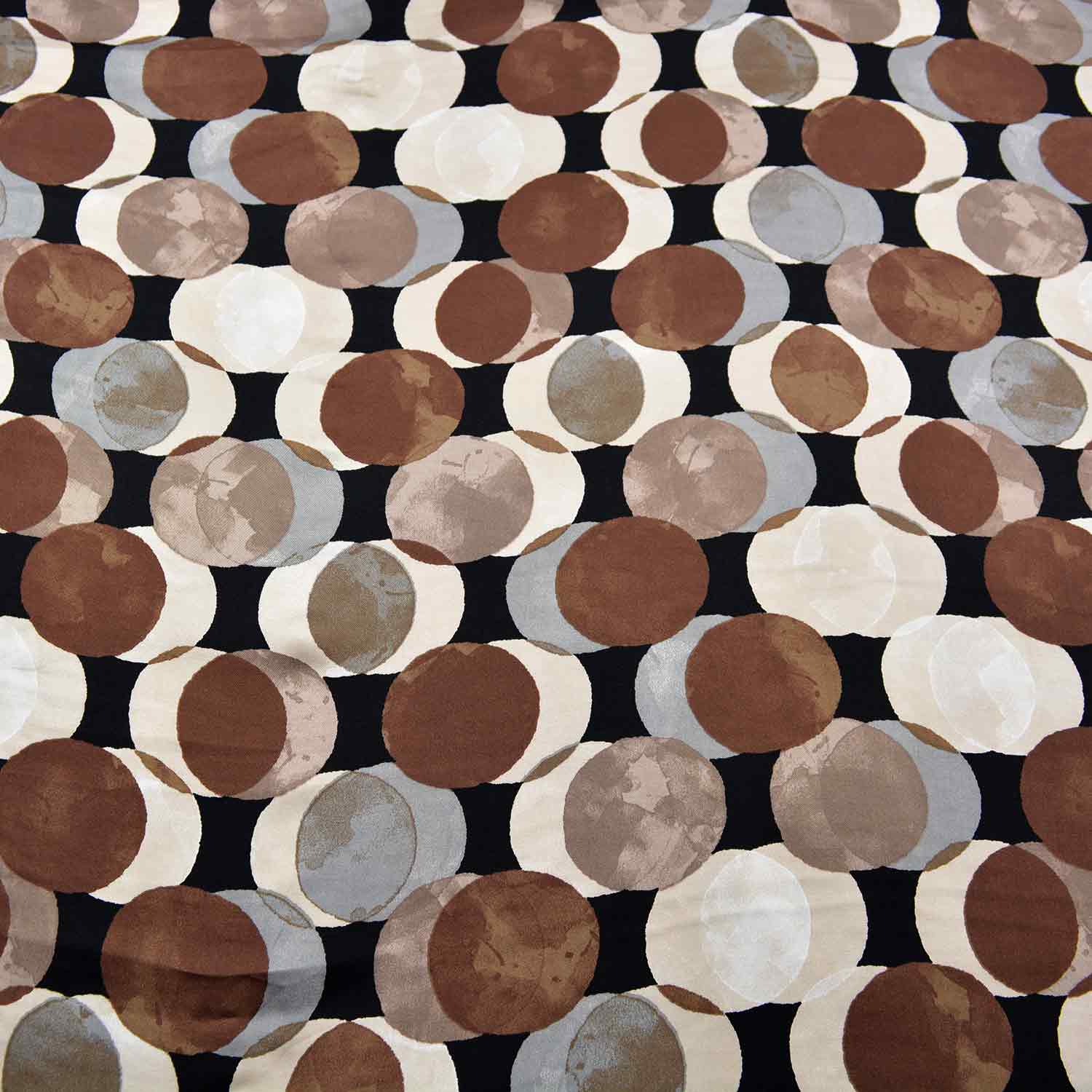 Der schwarze Untergrund des seidig glatten Stoffs ist mit Kreisen von etwa 6cm Durchmesser bedruckt.